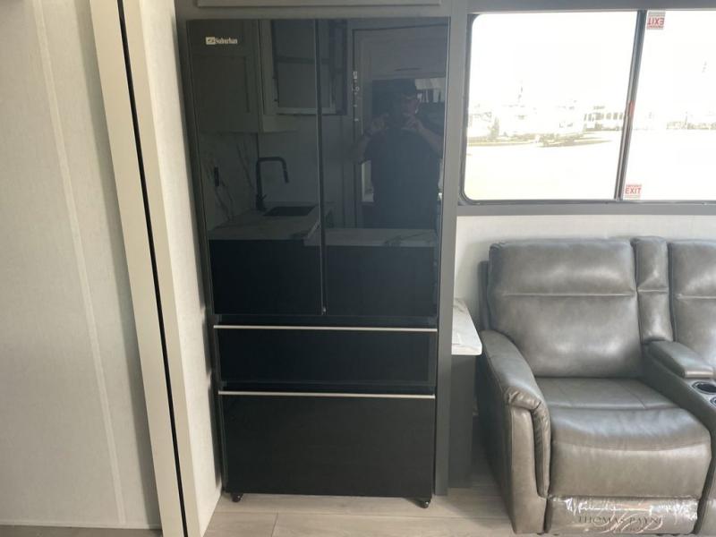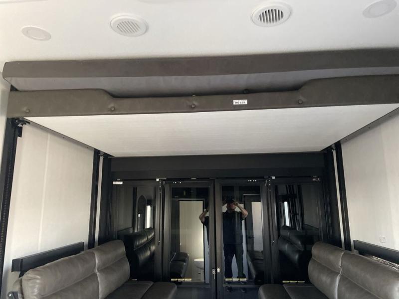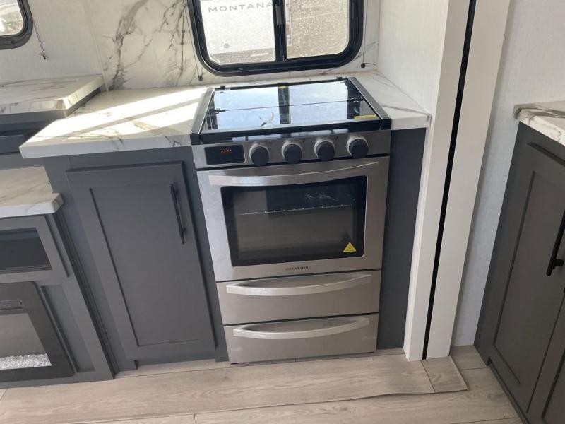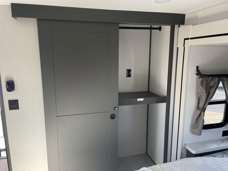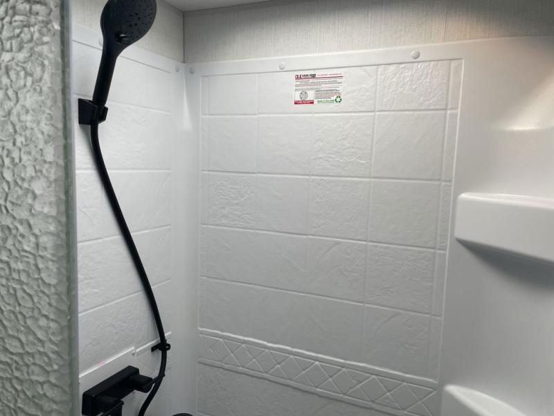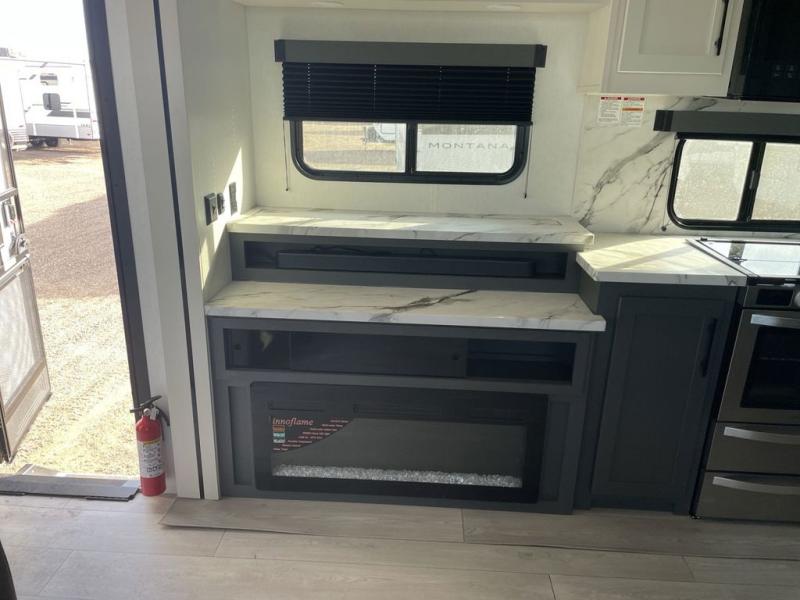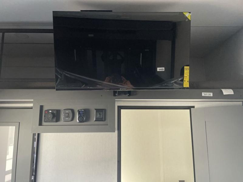This fifth-wheel toy hauler is the perfect vehicle for unwinding on the road. The front bedroom boasts a plush queen bed, dresser with hidden storage, and washer and dryer prep for added convenience. The full bathroom is complete with a generous 30” x 36” shower. The kitchen is a culinary dream, equipped with a 16 cu refrigerator, microwave, 3-burner cooktop, and pantry for all your favorite snacks. The living room is the perfect place to relax and entertain featuring theater seating, a spacious 64” sofa, a cozy fireplace, and an LED TV for movie nights. The 13’ 6” garage is the ultimate playground, featuring a 60” x 84” power bed with seat & sleep, and a laminated bed base, perfect for converting the space into a spacious bedroom or play area. Plus, a 32” x 96” loft bed for added sleeping capacity. Step outside and enjoy the fresh air with our patio rail kit, perfect for outdoor entertaining, and enjoy nature in the shade with our massive 14’ & 20’ awnings, and get ready to take your adventures to new heights!