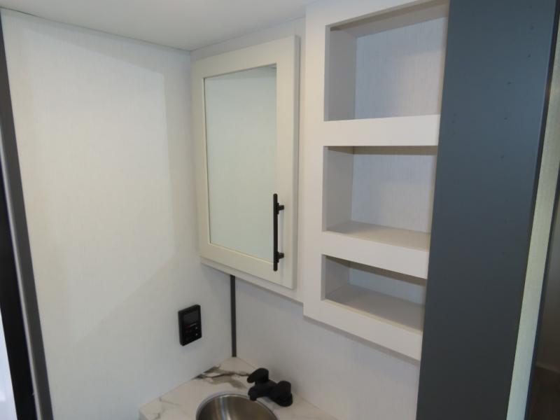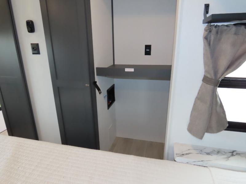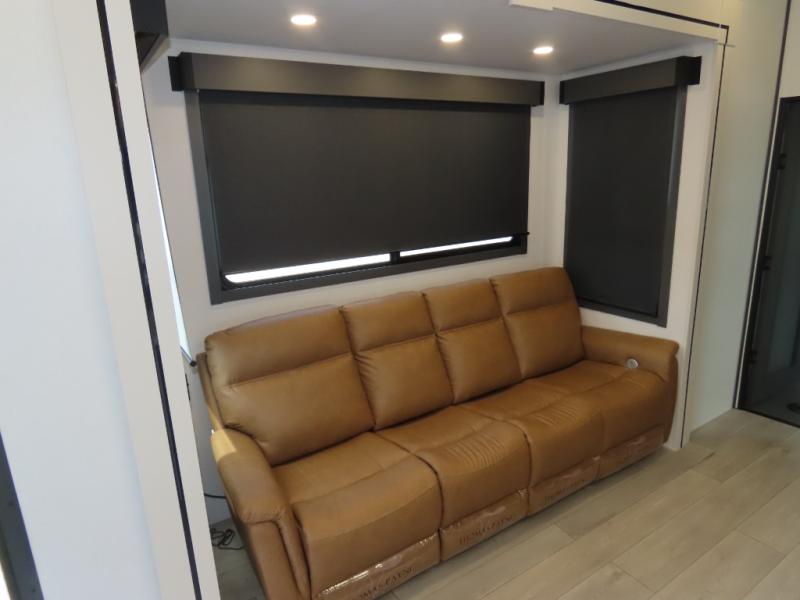 Inside, you'll find a spacious front bedroom with a plush queen bed, a dresser with hidden storage, and a washer and dryer prep for added convenience. The full bathroom boasts a 30” x 36” shower, perfect for freshening up after a hot day. The kitchen is a culinary dream, equipped with a 16 cu refrigerator, microwave, 3-burner cooktop, pull-out pantry, hutch, and kitchen island with flip-up extension. The living room is the perfect place to relax and unwind, featuring a super sofa theater, cozy fireplace, and LED TV for entertainment. Also in the 15’ garage, you'll find a power bed with sit & sleep and a laminated bed base, perfect for converting the space into a spacious bedroom or play area, plus, there is a 32” x 96” loft bed for added sleeping capacity. Finally, create unforgettable memories on the outside with comfort, simply open up the ramp door and enjoy the fresh air with our patio rail kit, and thanks to the 15’ & 15’ awnings, you'll have plenty of shade to relax in.