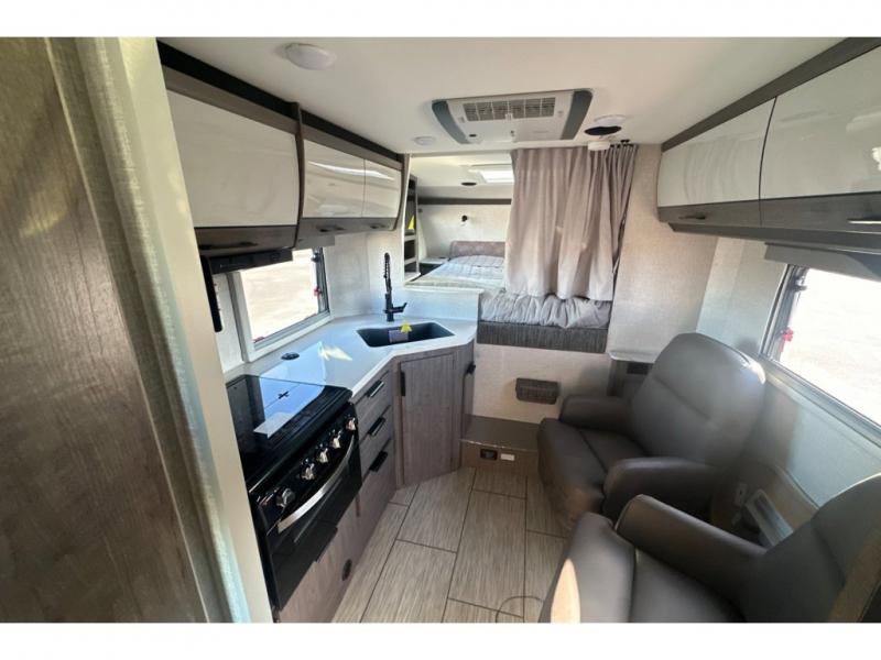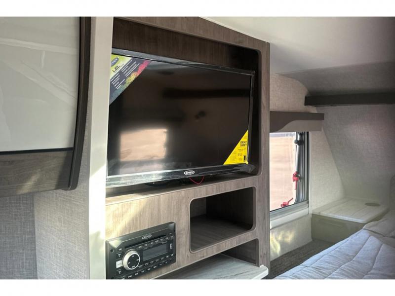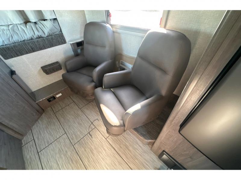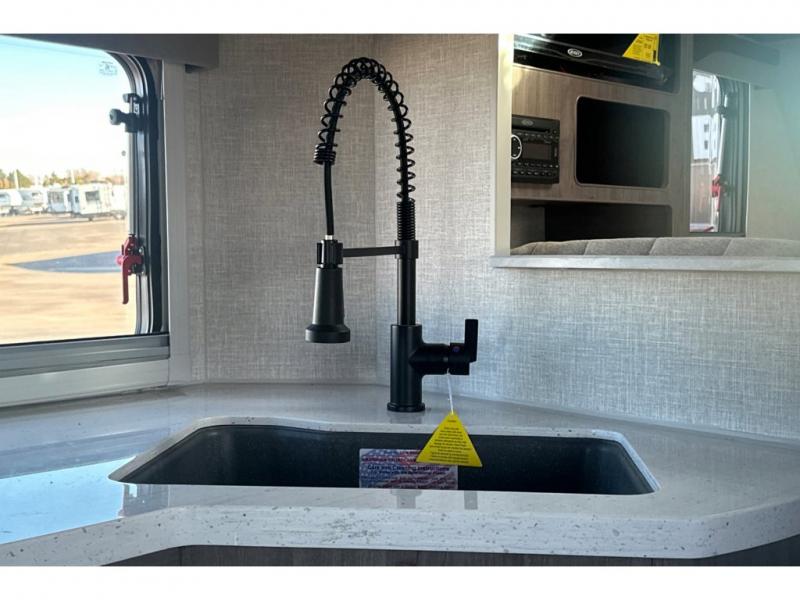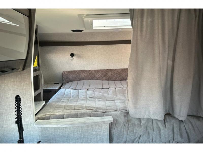 This truck camper combines the most desired must-have features with functionality! The front queen bed has a wardrobe next to it for your clothes, and places to set your electronics or a book, plus a privacy curtain to draw at night. Each swivel chair has a table in front for you to enjoy your meals at or you can switch them out for the optional theater seating for a comfortable place to take a quick afternoon nap. Start and end your days feeling refreshed with the wet bathroom, and throw any unwanted trash into the hidden trash compartment.
