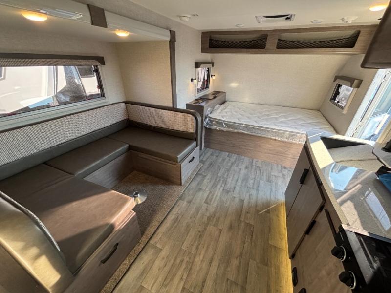 This travel trailer with double-size bunks, a front queen bed, plus a U-shaped dinette can sleep eight happy campers each night! You'll find a flush mount two-burner cooktop with a glass cover and a convection microwave oven to make meals each day, along with a 10.7 cu. ft. Furrion refrigerator to keep food fresh. The rear corner full bath is right next to the bunks for easy nighttime use, and here you'll find a residential radius soft shower door enclosure, a medicine cabinet with a mirror door, plus a dual pane skylight for added head room and natural lighting. Outside, the power awning will provide shade as you visit with campground neighbors, and the pass-through storage with Slam Latch will let you easily grab the fishing poles before heading down to the dock!