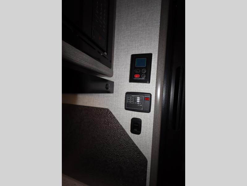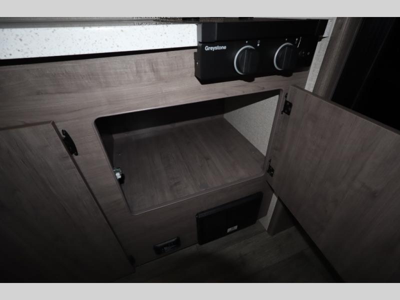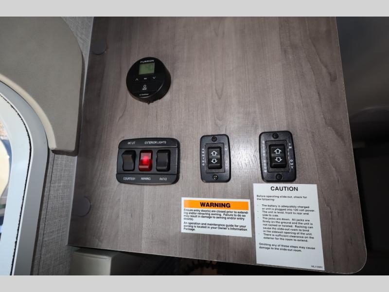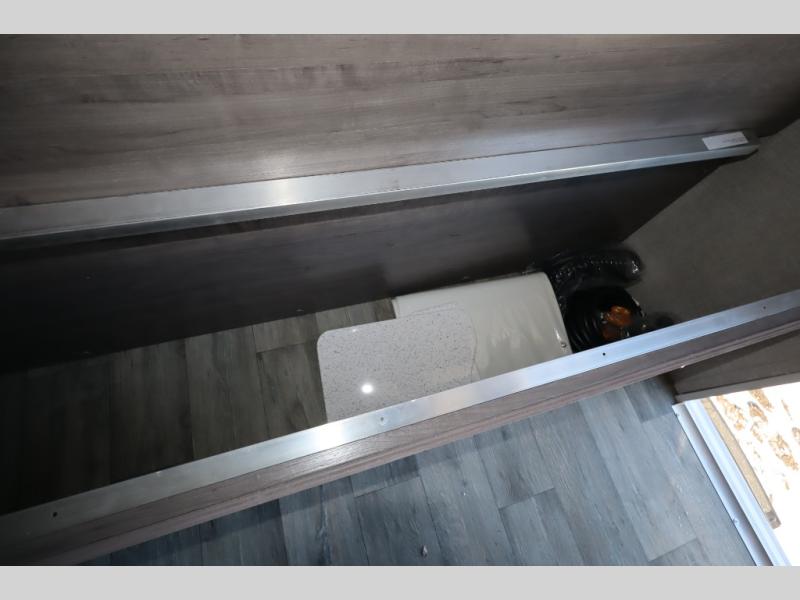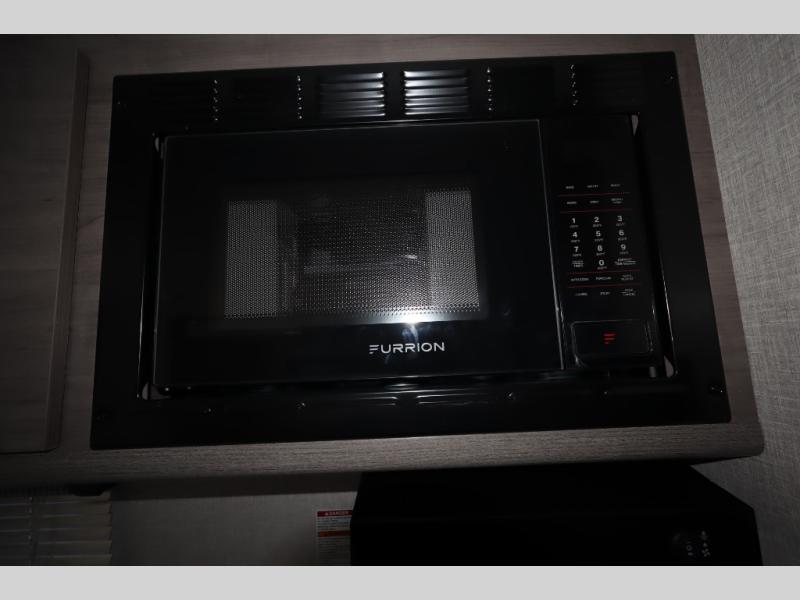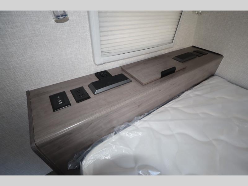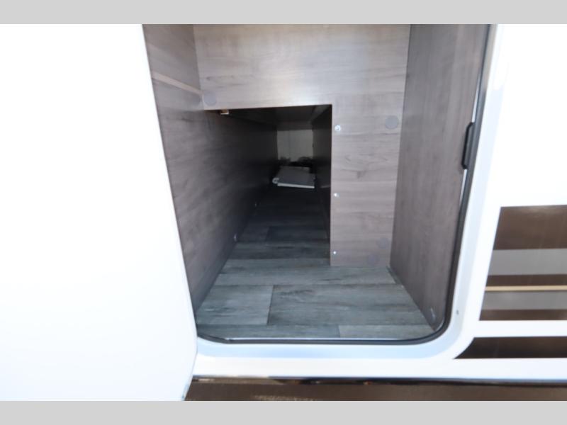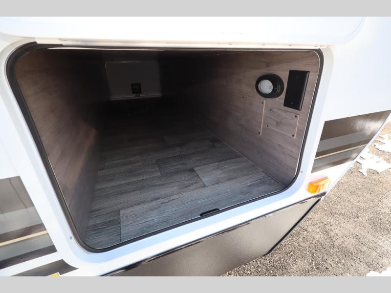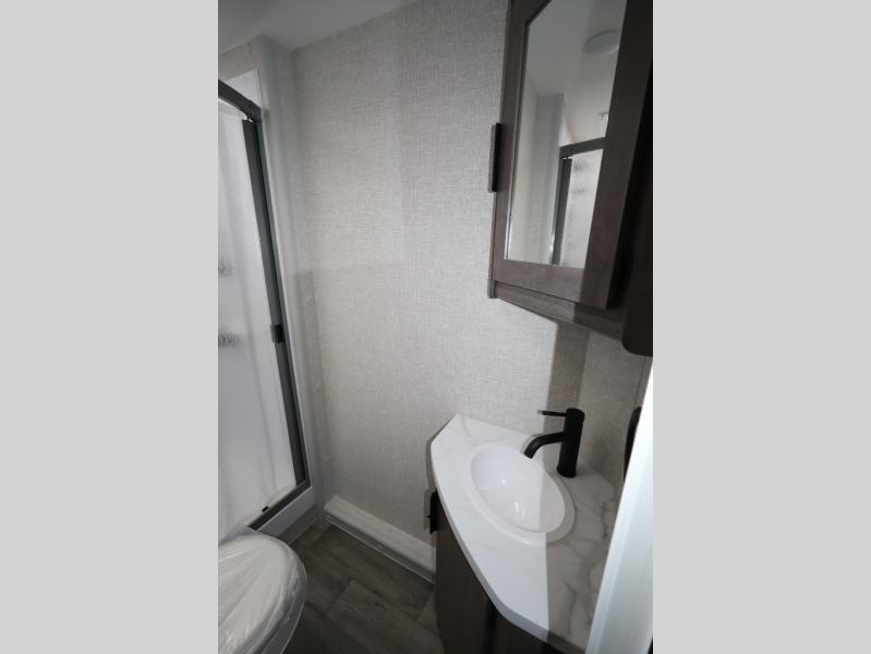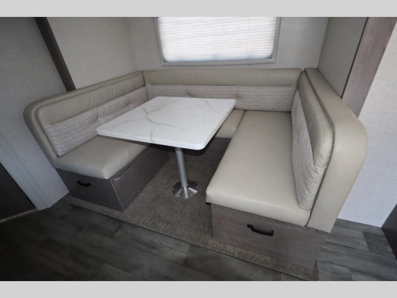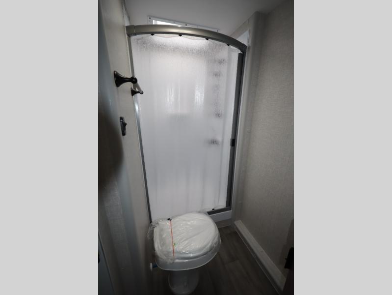 This travel trailer with double-size bunks, a front queen bed, plus a U-shaped dinette can sleep eight happy campers each night! You'll find a flush mount two-burner cooktop with a glass cover and a convection microwave oven to make meals each day, along with a 10.7 cu. ft. Furrion refrigerator to keep food fresh. The rear corner full bath is right next to the bunks for easy nighttime use, and here you'll find a residential radius soft shower door enclosure, a medicine cabinet with a mirror door, plus a dual pane skylight for added head room and natural lighting. Outside, the power awning will provide shade as you visit with campground neighbors, and the pass-through storage with Slam Latch will let you easily grab the fishing poles before heading down to the dock!