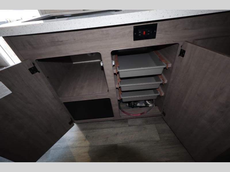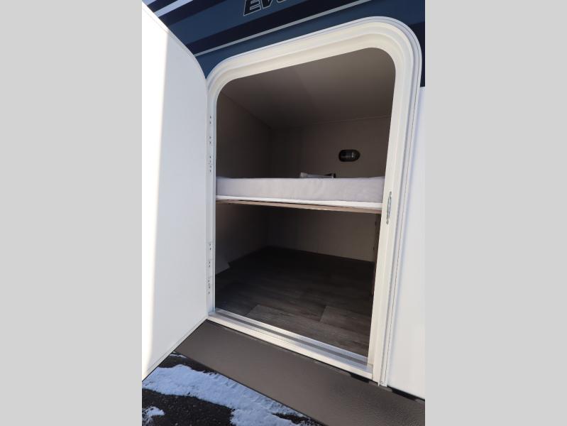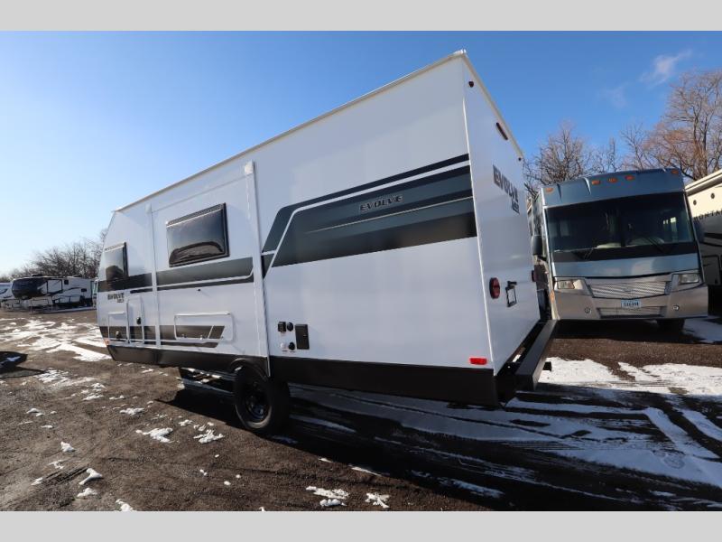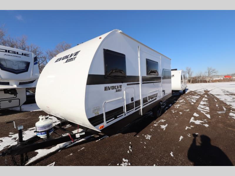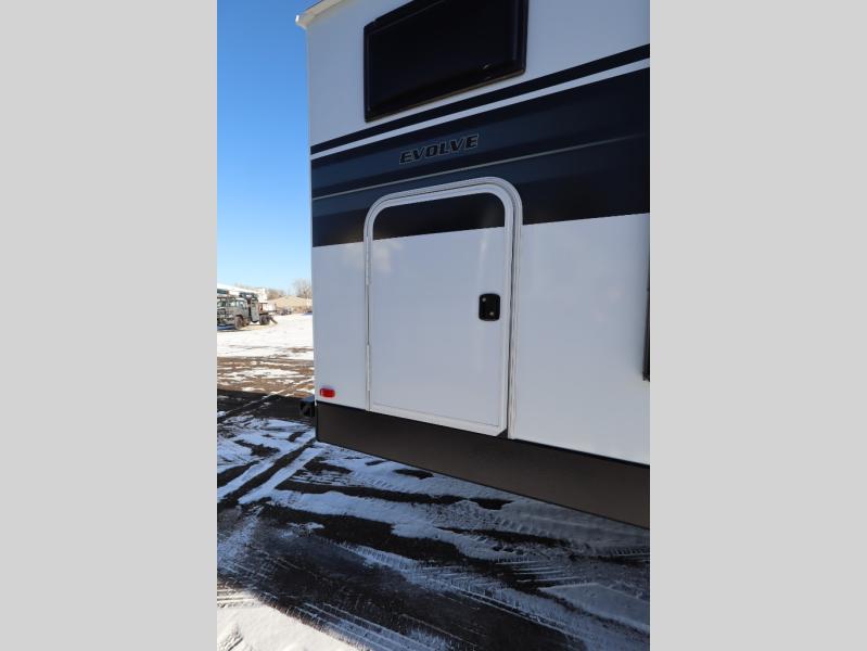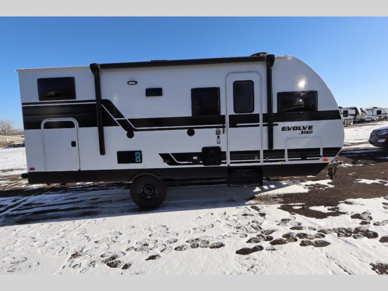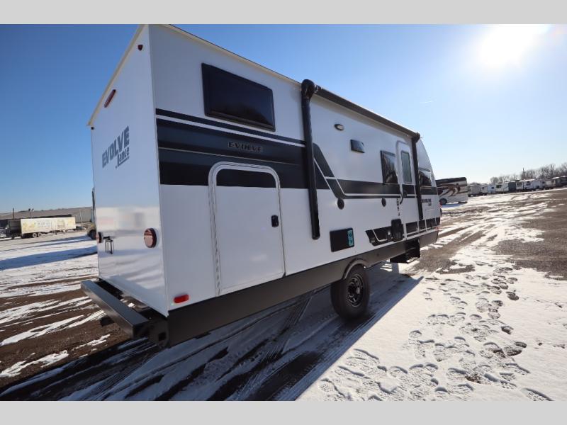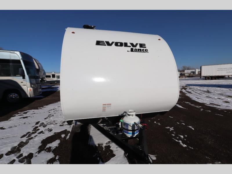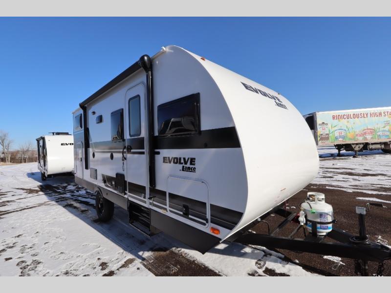 With any Evolve travel trailer by Lance, you will find a modern design, a durable build, and comfortable features to make the camping lifestyle easier than ever! Each one is built with aluminum framed sidewalls, floor and ceiling, block foam insulation throughout, and a laminated fiberglass bonded exterior with Azdel substrate. There are also Keyed-Alike storage compartment doors, an exterior wash station, and a torsion axle suspension for smooth towing. The electrical features will keep your adventures going with a 60-amp converter/loadcenter, a dual battery rack, 12V/USB charging port(s), and a systems monitor panel for easy access to your unit's functions. You will also find Lite-Ply cabinet construction inside, along with decorative backsplash, solid surface, lightweight countertops and table, and many more comforts!