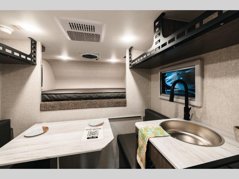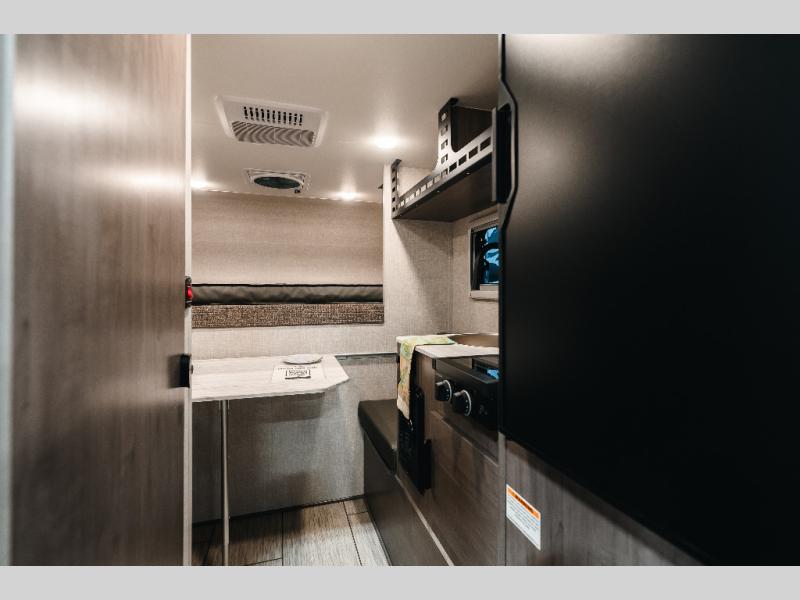 This lightweight truck camper is perfect for short bed trucks. The compact galley includes a two-burner cooktop, a stainless-steel sink, and a 12V refrigerator to keep your food fresh. A dinette provides a place to dine together or play games in the evening, and there is Molle-backed cabinet framing for extra storage. You will appreciate the wet bath with ducted heat and foot flush marine toilet, so you don't have to leave your camper in the middle of the night. A queen-size bed will provide a great night's rest, while the reading lights let you stay up late with a book!