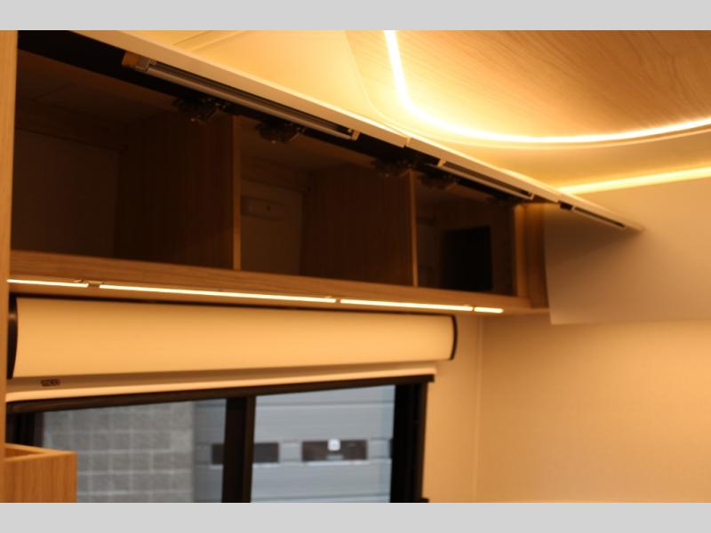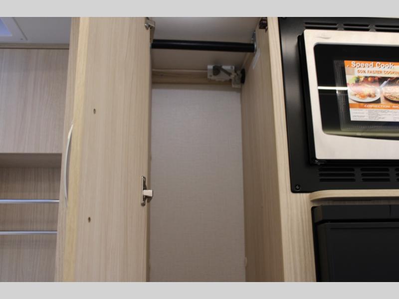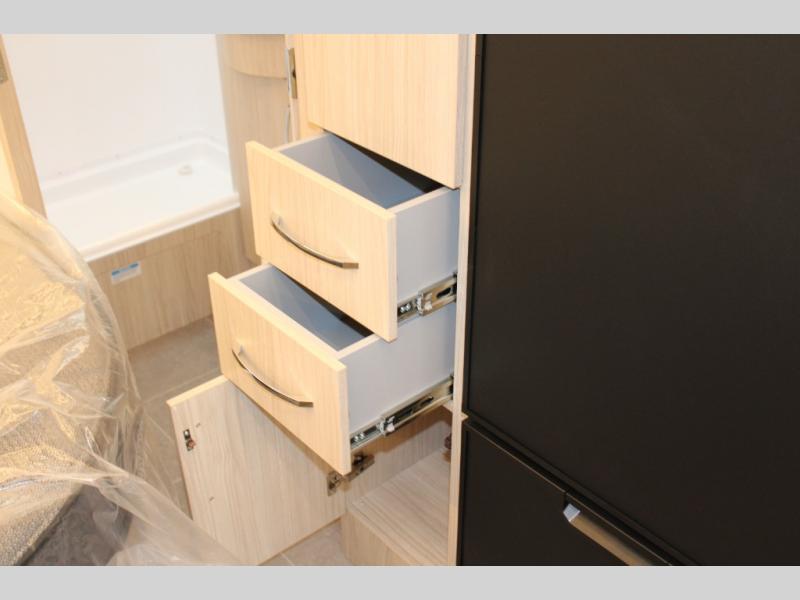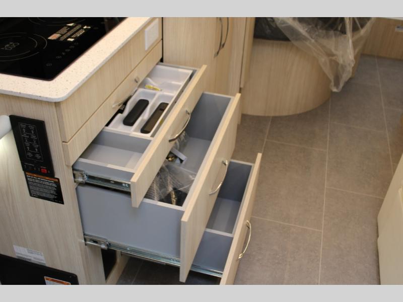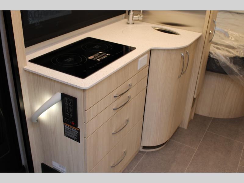 You can sleep four comfortably in this coach thanks to the 52" x 76" rear corner bed, and the dinette+, or you might want to choose the optional leisure lounge. The galley includes a stainless steel sink, a two burner cooktop, plus a pull-out panty and a 12V compressor refrigerator for food storage. The rear corner bath will allow you to stay clean throughout your many travels, and there is plenty of storage space for your essentials. You will also love the powered box awning with a wind sensor and LED lights for those late-night evenings outdoors with friends.