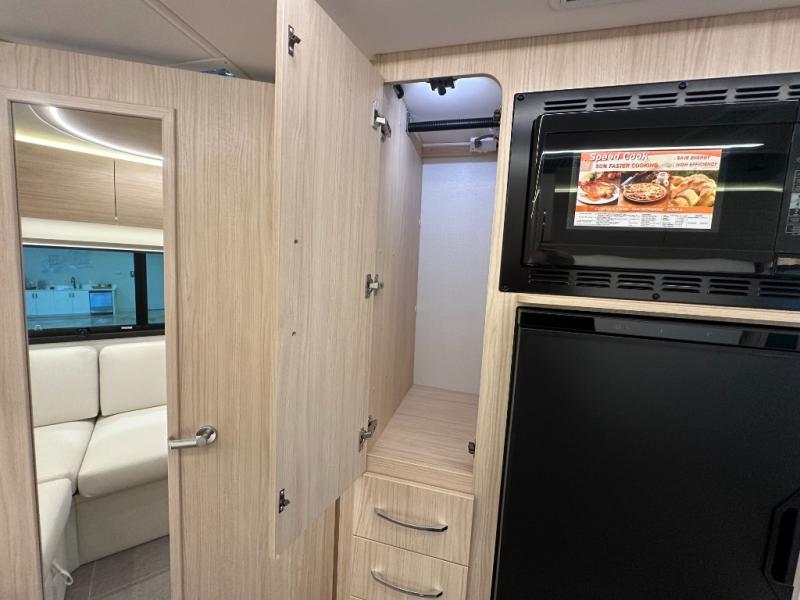 You will be impressed with this Unity Class B+ diesel motorhome because of the unique rear living space that has a sectional sofa, adjustable ottoman, and flexible bathroom door that will fold inward or outward depending on where you need the extra space. With a wardrobe, a bathroom medicine cabinet, and a large pull-out pantry, there is no doubt that you will be able to find storage space for all of your belongings, and having two living areas, a Murphy bed for nighttime, and a flush-mount LP cooktop to make meals will let you travel for however long you like.