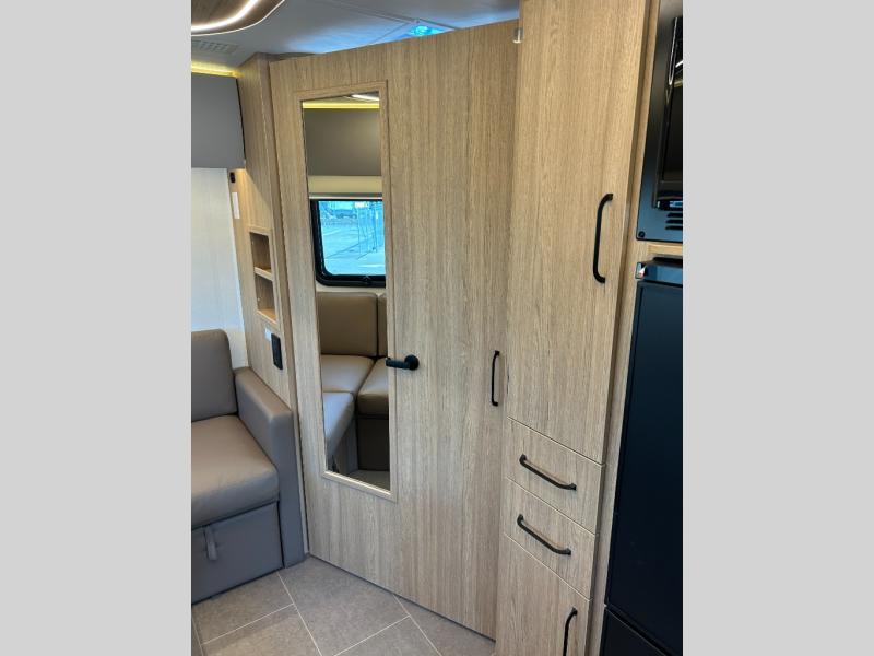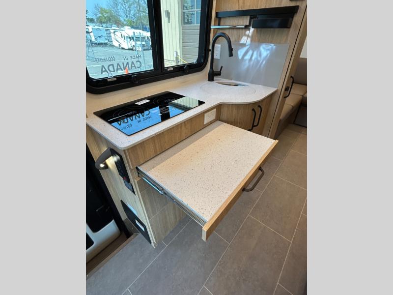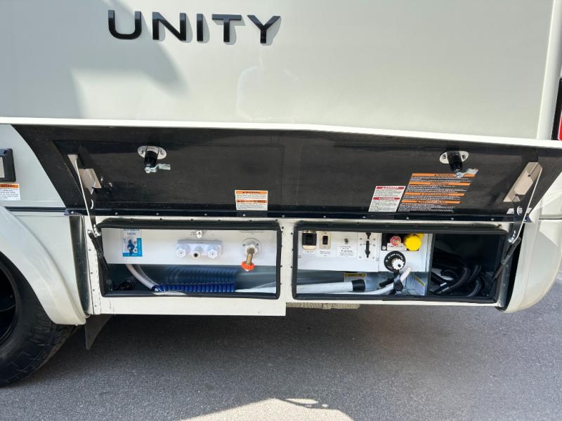 You will be impressed with this Unity Class B+ diesel motorhome because of the unique rear living space that has a sectional sofa, adjustable ottoman, and flexible bathroom door that will fold inward or outward depending on where you need the extra space. With a wardrobe, a bathroom medicine cabinet, and a large pull-out pantry, there is no doubt that you will be able to find storage space for all of your belongings. Also, having two living areas, a Murphy bed for nighttime, and an induction cooktop to make meals, you can travel for however long you like!