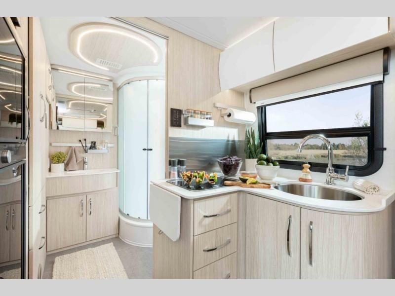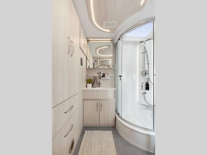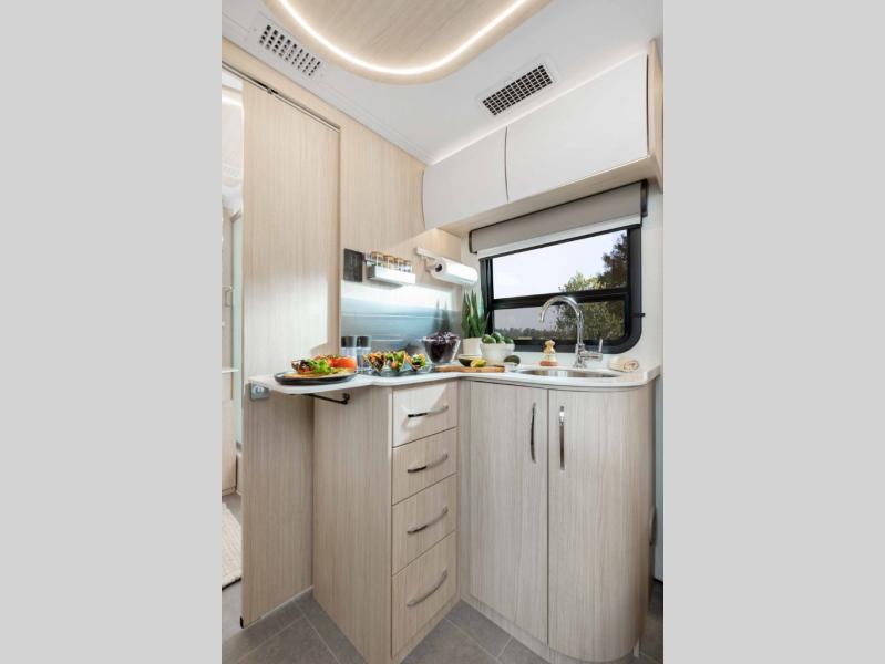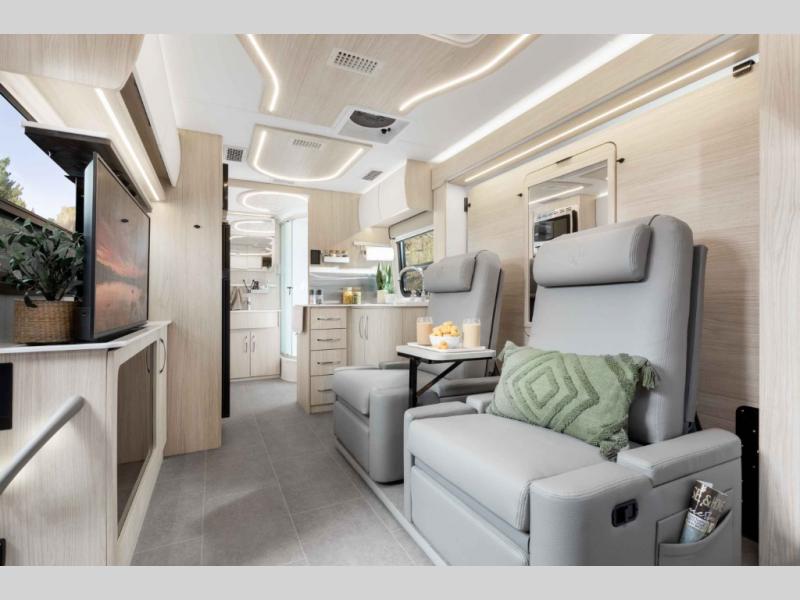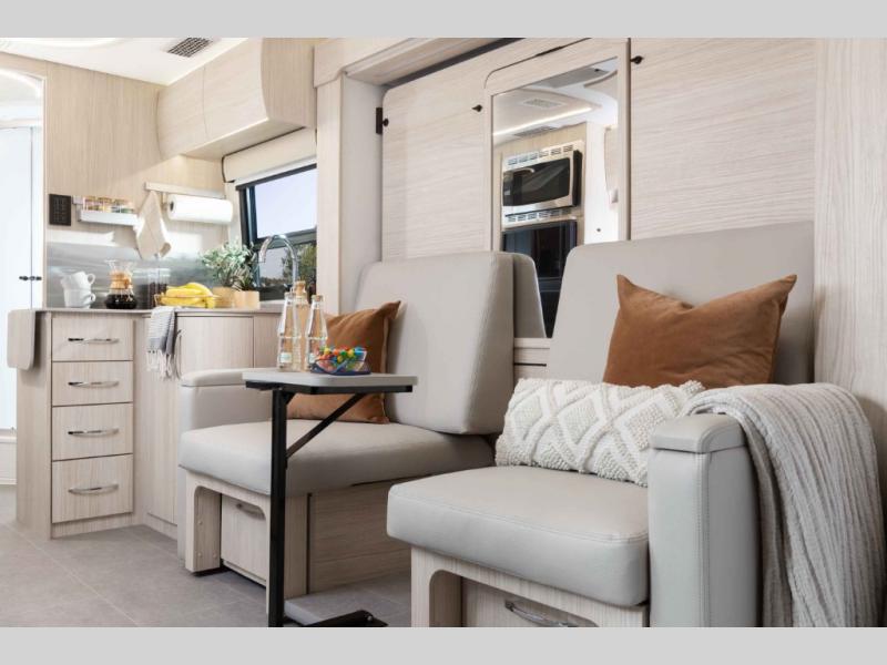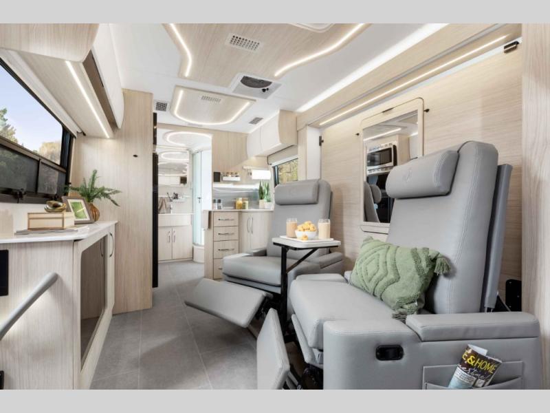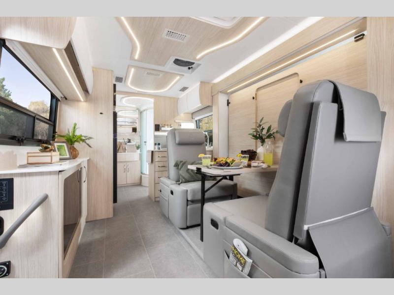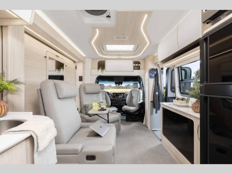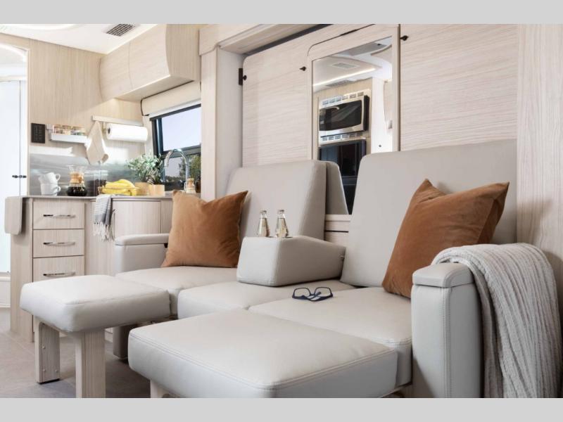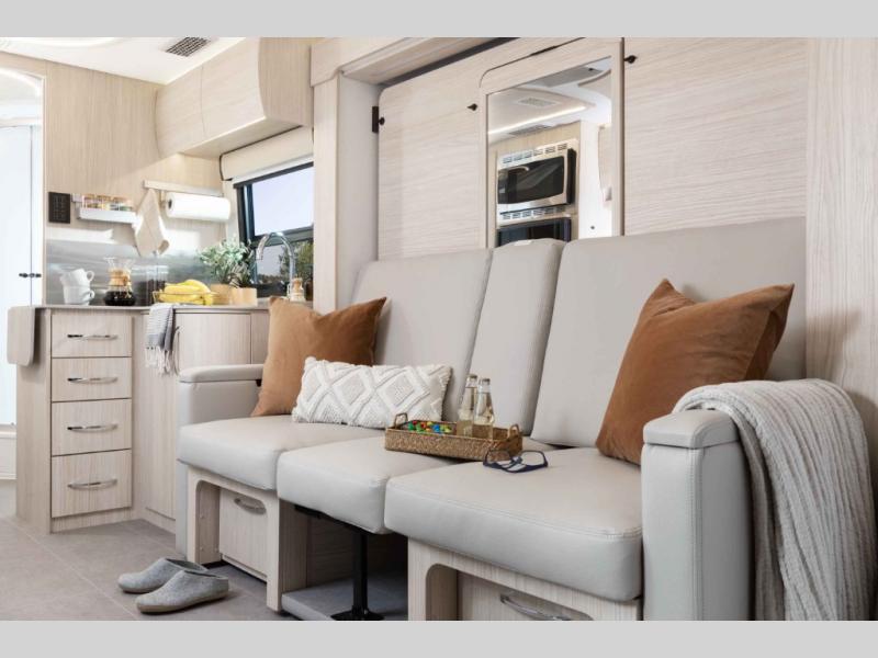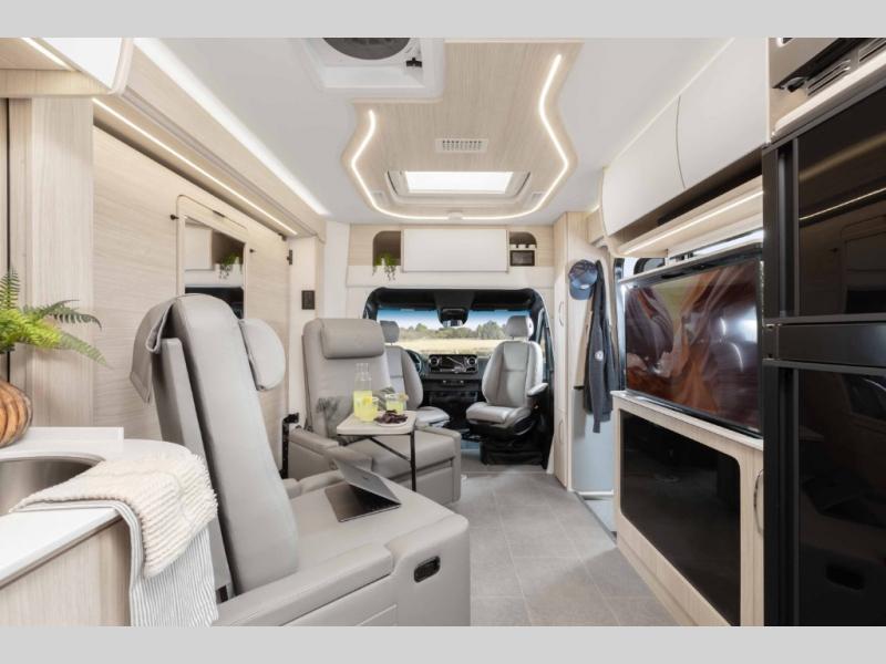 Each Unity Class B+ diesel motorhome by Leisure Travel sits on a durable Mercedes-Benz Sprinter 3500 dual rear wheel chassis with a 2.0-L Turbocharged I-4 diesel engine to power your adventures. The powder coated steel undercarriage support structure and vacuum-bonded construction provide a coach that will last for years, and there are eight sleek exterior paint options to make the coach your own. You'll love driving the Unity with its electronic stability control, adaptive cruise control, 9-speed automatic transmission with quieter noise levels and more comfort. There is even a digital mirror with sharp high-resolution that can be switched between convectional display and digital display for convenience. The luxurious interior includes Ultraleather furniture, a contoured solid surface Corian countertop in the kitchen, new decor options, plus many more comforts. And all of your power need will be met with 270-Ah, 12V Lithium coach batteries with an internal heating system, plus a 3000W pure sine inverter and a 30 Amp power cord. If you choose the optional 60th Anniversary Edition, you will enjoy the Diamond White exterior paint, diamond-quilted upholstery, Cool Ice Ultrafabrics, matte black hardware, and more elegant features that are exclusive to this package!