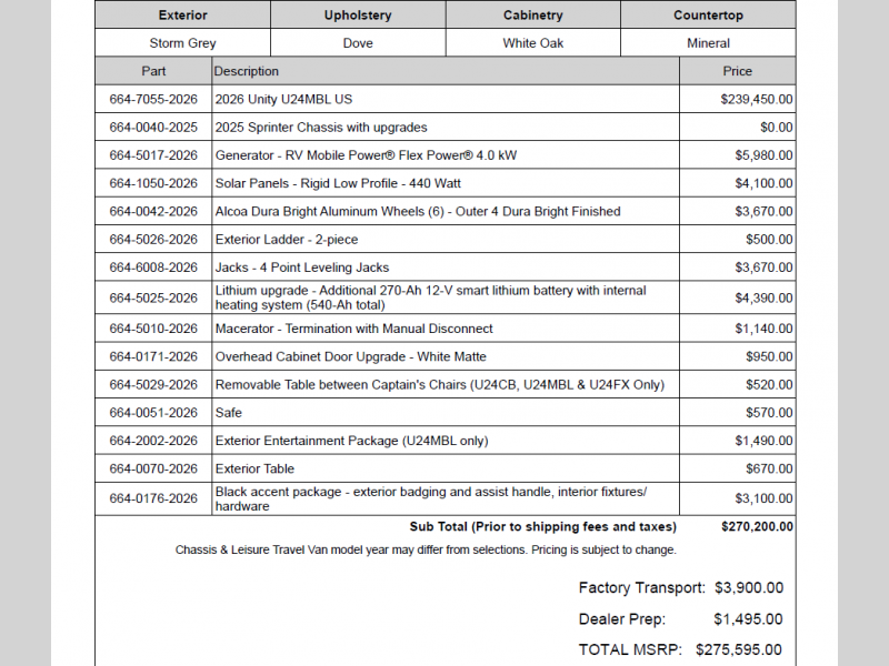 MSRP including factory to dealer transport charge and dealer prep = $275,595