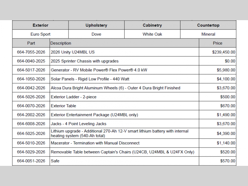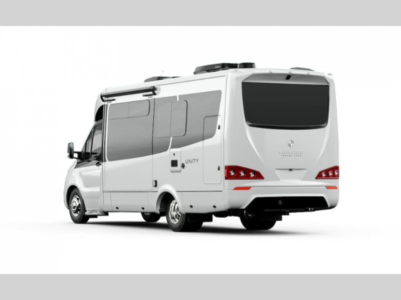 Each Unity Class B+ diesel motorhome by Leisure Travel Van sits on a durable Mercedes-Benz Sprinter 3500 dual rear wheel chassis with a 2.0-L Turbocharged I-4 diesel engine to power your adventures. The powder coated steel undercarriage support structure and vacuum-bonded construction provide a coach that will last for years, and there are eight sleek exterior paint options to make the coach your own. You'll love driving the Unity with its electronic stability control, adaptive cruise control, 9-speed automatic transmission with quieter noise levels and more comfort. There is even a digital mirror with sharp high-resolution that can be switched between conventional display and digital display for convenience. The luxurious interior includes Ultraleather furniture, a contoured solid surface Corian countertop in the kitchen, new decor options, plus many more comforts. And all of your power need will be met with dual 270-Ah, 12V Lithium coach batteries with an internal heating system, plus a 3000W pure sine inverter and a 30 Amp power cord.