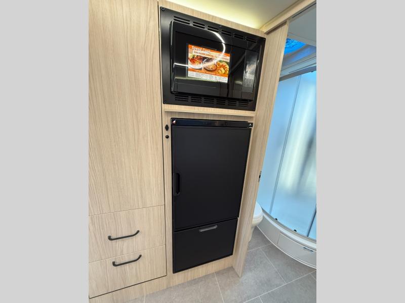 Traveling will be convenient and comfortable with this versatile Murphy bed and redesigned leisure lounge, which includes dual reclining chairs, an updated dinette table and a large panoramic window! At night, the lounge seating is hidden as you flip-down the Murphy bed for a comfortable night's rest. In the morning, tuck it all away to bring back your living space. You will also enjoy the convenient kitchen amenities in place so you can easily whip up a meal or snack while you are stopped, and for overnight you can get refreshed for a new day in the rear bath featuring a radius shower with a skylight, a sink, and closet space for your things.
