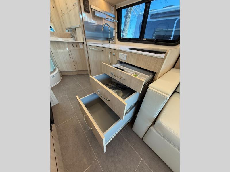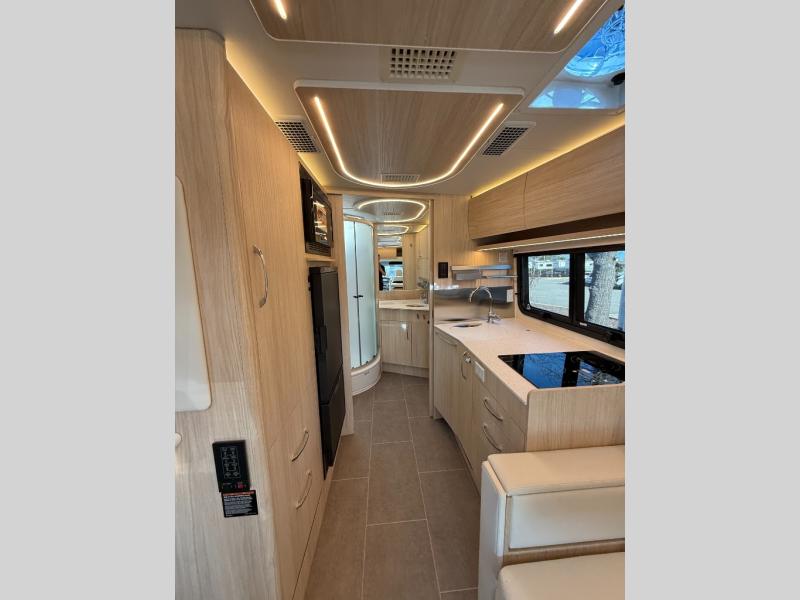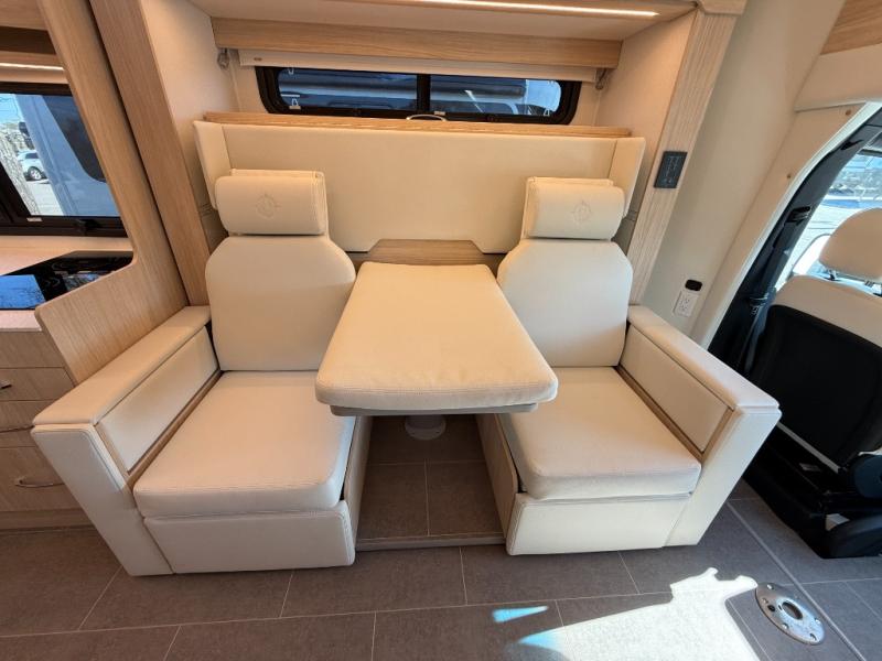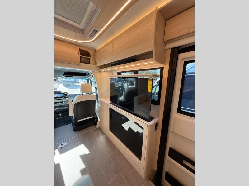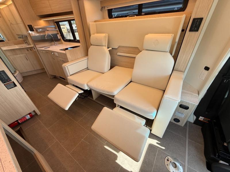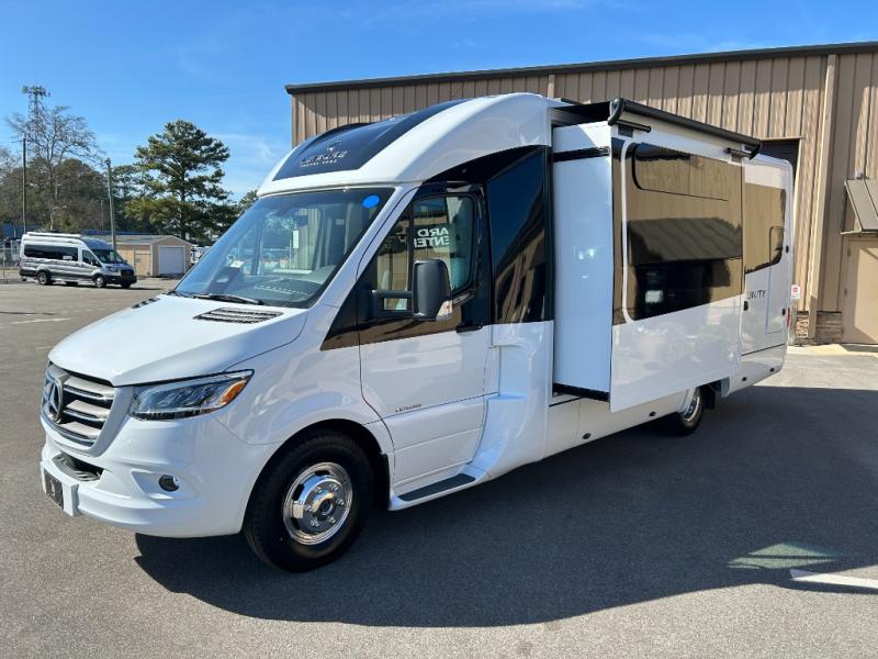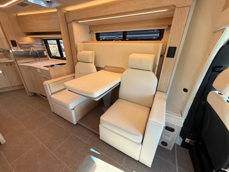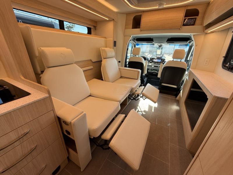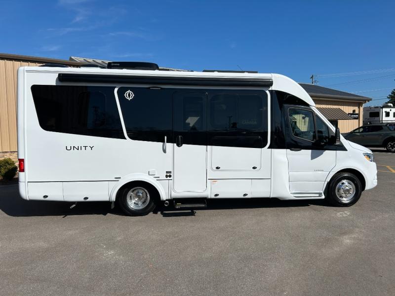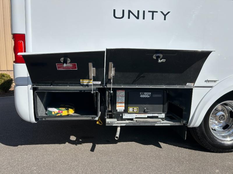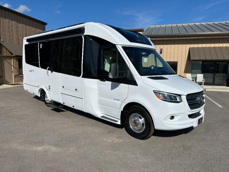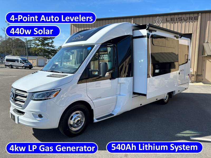 Each Unity Class B+ diesel motorhome by Leisure Travel sits on a durable Mercedes-Benz Sprinter 3500 dual rear wheel chassis with a 2.0-L Turbocharged I-4 diesel engine to power your adventures. The powder coated steel undercarriage support structure and vacuum-bonded construction provide a coach that will last for years, and there are sleek exterior paint options to make the coach your own. You'll love driving the Unity with its electronic stability control, adaptive cruise control, 9-speed automatic transmission with quieter noise levels and more comfort. The luxurious interior includes Ultrafabrics, a contoured solid surface Corian countertop in the kitchen, modern cabinetry finishes, plus many more comforts. And all of your power need will be met with the upgraded dual 270-Ah 12V Lithium coach batteries (540Ah combined) with an internal heating system, plus a 3000 watt pure sine inverter and a 30 Amp power cord.