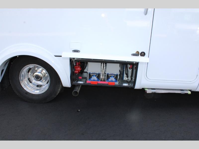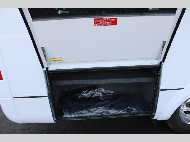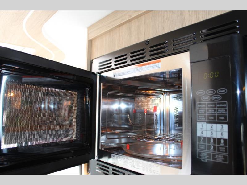 You will enjoy the two distinct living spaces with this Unity Class B+ diesel motorhome as you travel to all of your favorite locations. The dinette in front serves for dining and sleeping when converted into the optional front bed with the use of the front swivel captain's chairs for support. This is the perfect spot for when the grandchildren or guests come along. In back, you will find a comfortable lounge area with a 28" TV for inside entertainment plus a Murphy bed which easily converts the space into a bedroom that can be hidden away in the wall once morning arrives. The stainless steel convection microwave and the large pull-out pantry make it easy to create your delicious meals.