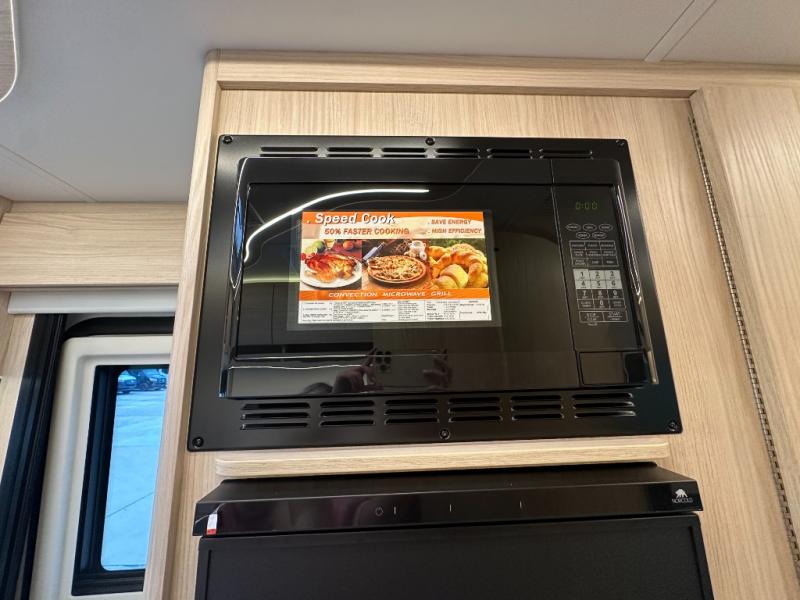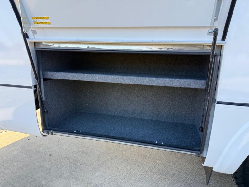You will enjoy the two distinct living spaces with this Unity Class B+ diesel motorhome as you travel to all of your favorite locations. The dinette in front serves for dining and sleeping when converted into the optional front bed with the use of the front swivel captain's chairs for support. This is the perfect spot for when the grandchildren or guests come along. In back, you will find a comfortable lounge area with a 28" TV for inside entertainment plus a Murphy bed which easily converts the space into a bedroom that can be hidden away in the wall once morning arrives. The stainless steel convection microwave and the large pull-out pantry make it easy to create your delicious meals.