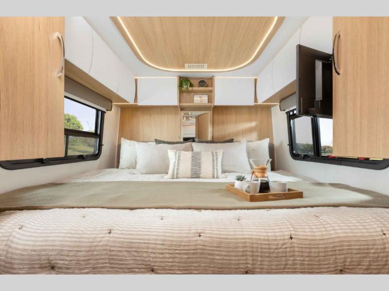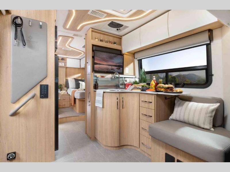 Each Unity Class B+ diesel motorhome by Leisure Travel sits on a durable Mercedes-Benz Sprinter 3500 dual rear wheel chassis with a 2.0-L Turbocharged I-4 diesel engine to power your adventures. The powder coated steel undercarriage support structure and vacuum-bonded construction provide a coach that will last for years, and there are eight sleek exterior paint options to make the coach your own. You'll love driving the Unity with its electronic stability control, adaptive cruise control, 9-speed automatic transmission with quieter noise levels and more comfort. There is even a digital mirror with sharp high-resolution that can be switched between convectional display and digital display for convenience. The luxurious interior includes Ultraleather furniture, a contoured solid surface Corian countertop in the kitchen, new decor options, plus many more comforts. And all of your power need will be met with 270-Ah, 12V Lithium coach batteries with an internal heating system, plus a 3000W pure sine inverter and a 30 Amp power cord. If you choose the optional 60th Anniversary Edition, you will enjoy the Diamond White exterior paint, diamond-quilted upholstery, Cool Ice Ultrafabrics, matte black hardware, and more elegant features that are exclusive to this package!