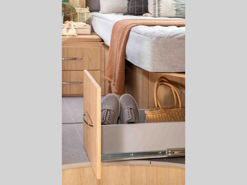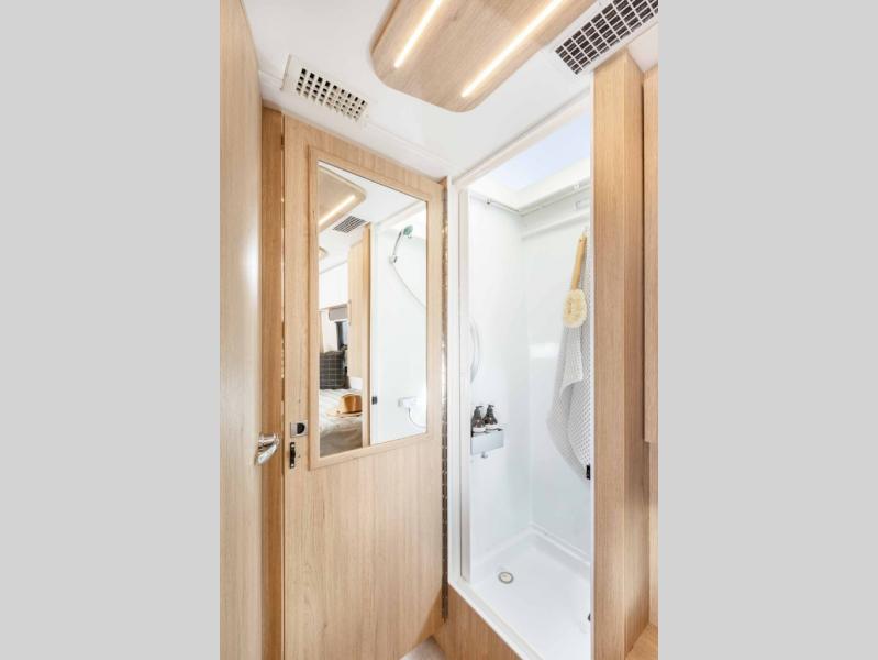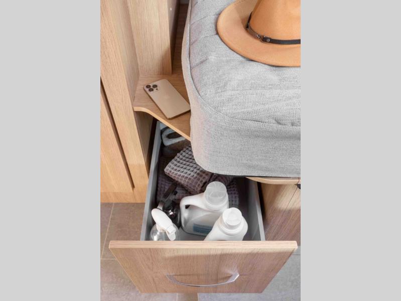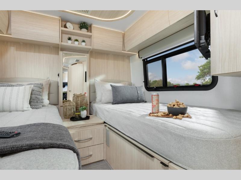 Comfortable and versatile features allow you to travel the way you like in this Unity Class B+ diesel motorhome. You have plenty of choices on how you want to sleep and how you would like to dine. Each night, you can sleep separately from your spouse on one of the two twin-size beds or convert the twins into one king-size bed for more space together. Even the bathroom area is multi-functional because of its separate lavatory from the enclosed shower, and the adjustable front seating area is handy for dining, sleeping, or playing a card game with the family. The flush-mount LP cooktop makes it easy to make your delicious meals, and if you have any leftovers, then you can store them inside the 12V compressor refrigerator with a bottom freezer drawer.