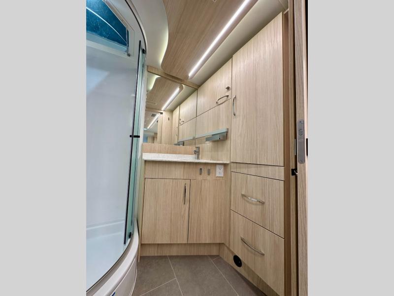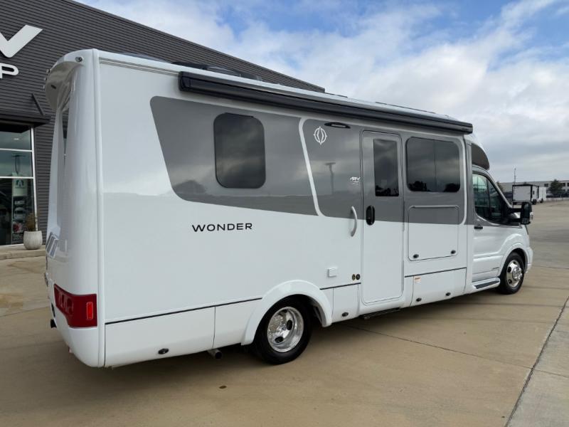 With any Leisure Travel Wonder Class B+ gas motorhome, the construction includes vacuum bonded aluminum framed insulated contoured sidewalls and a domed roof with fiberglass exterior, and a floor with composite exterior on a Ford Transit dual rear wheel chassis. Some highlights include the 16" heavy-duty forged aluminum alloy wheels, the auto high-beam headlamps, and the advance active safety features. The interior offers the SYNC 4 navigation system, curved soft close overhead cabinetry doors with hidden catches, full extension ball bearing soft close drawer tracks, LED aisle lighting and above cabinet hidden accent lights, and tile look vinyl flooring throughout for style and easy care. Optional AWD is available, along with the optional 60th Anniversary Edition decor and exterior color, solar panels for off-grid capability, a battery upgrade, and more!