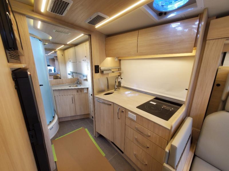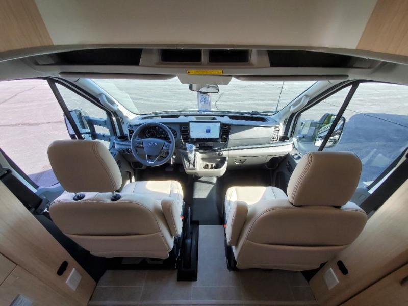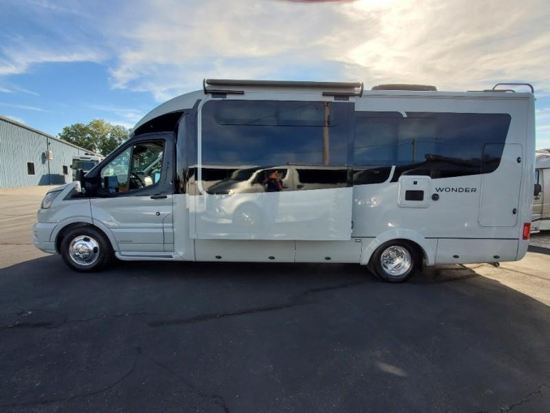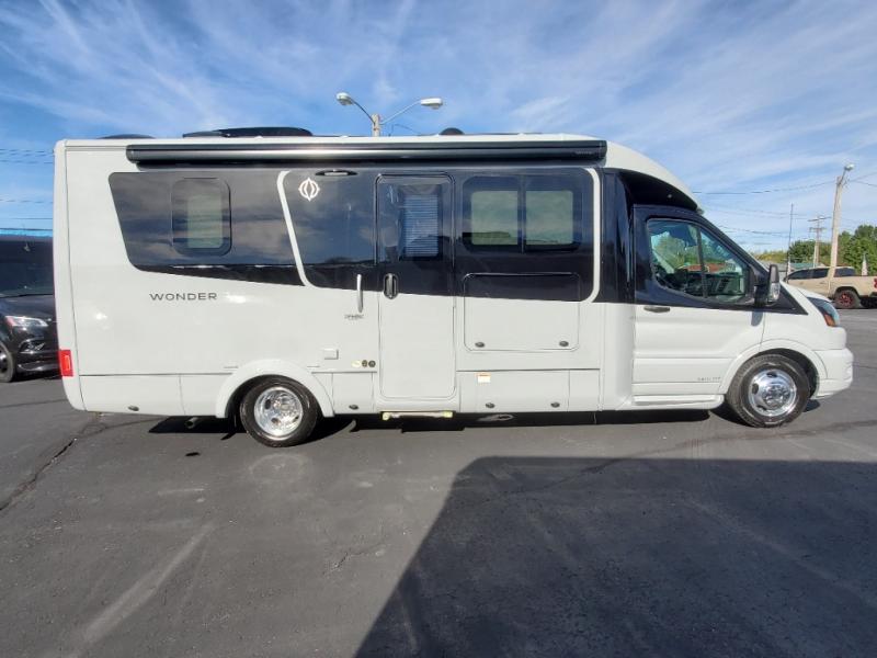 With any Leisure Travel Wonder Class B+ gas motorhome, the construction includes vacuum bonded aluminum framed insulated contoured sidewalls and a domed roof with fiberglass exterior, and a floor with composite exterior on a Ford Transit dual rear wheel chassis. Some highlights include the 16" heavy-duty forged aluminum alloy wheels, the auto high-beam headlamps, and the advance active safety features. The interior offers the SYNC 4 navigation system, curved soft close overhead cabinetry doors with hidden catches, full extension ball bearing soft close drawer tracks, LED aisle lighting and above cabinet hidden accent lights, and tile look vinyl flooring throughout for style and easy care. Optional AWD is available, along with the optional 60th Anniversary Edition decor and exterior color, solar panels for off-grid capability, a battery upgrade, and more!