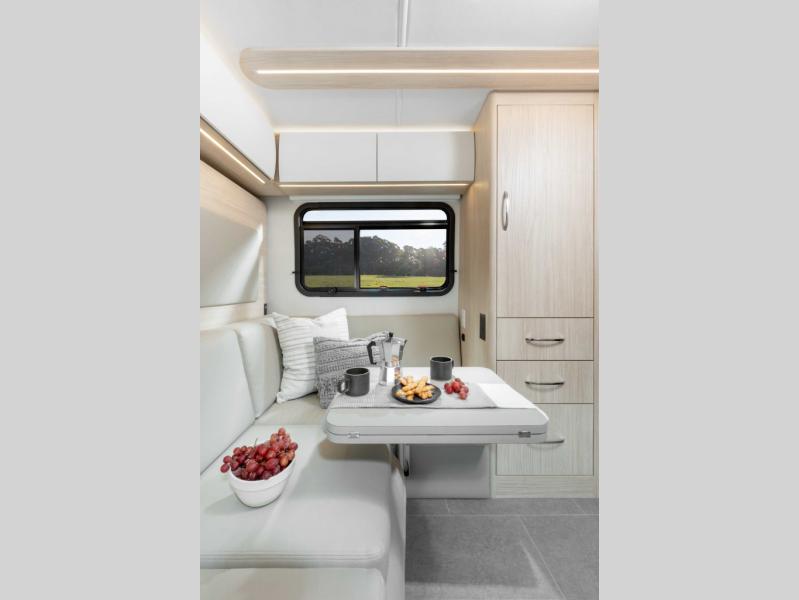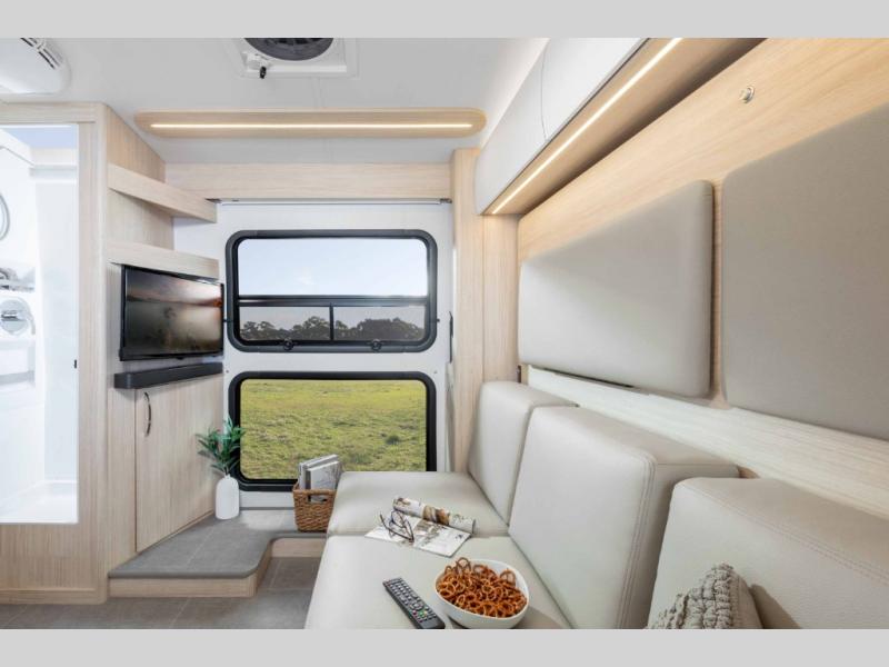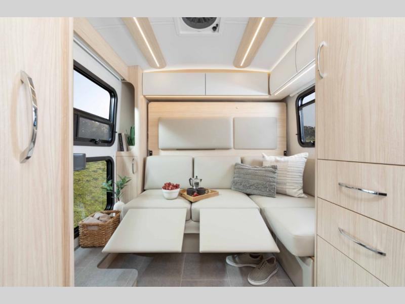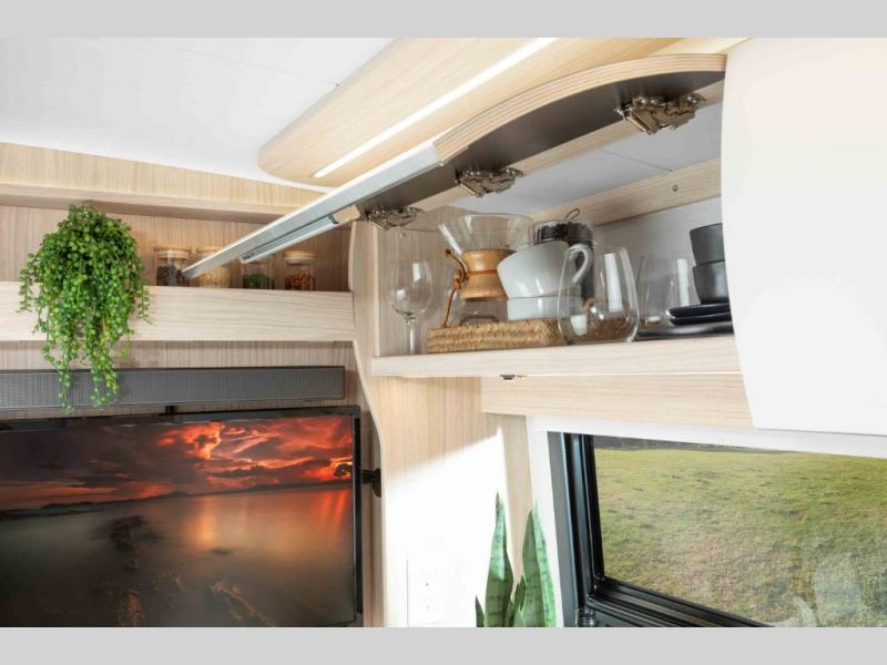 This coach combines comfort with versatility and convenience allowing you to travel wherever and whenever you want with your three favorite people! You will find seatbelts for four, a rear Murphy bed, and a removable front dinette area with an optional bed to sleep four. The rear offers a residential-style sectional lounge sofa with footrests and a swivel table to create a work station or another dining space. The galley offers a flip-down extension for more prep and serving space, a convection microwave oven, a flush mount LP cooktop with hinged glass cover, a garbage can, a pull-out pantry, and more to enjoy cooking while on the go.