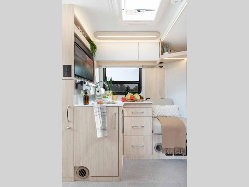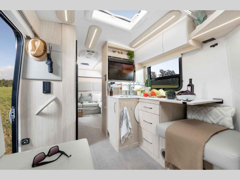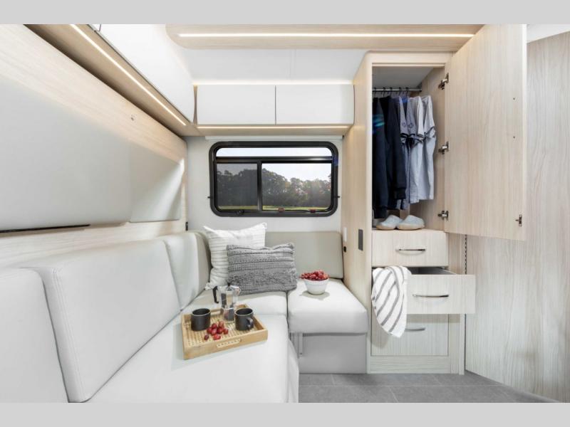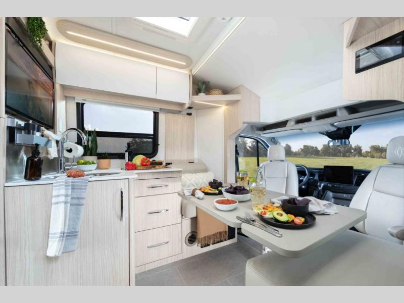 With any Leisure Travel Wonder Class B+ gas motorhome, the construction includes vacuum bonded aluminum framed insulated contoured sidewalls and a domed roof with fiberglass exterior, and a floor with composite exterior on a Ford Transit dual rear wheel chassis. Some highlights include the 16" heavy-duty forged aluminum alloy wheels, the auto high-beam headlamps, and the advance active safety features. The interior offers the SYNC 4 navigation system, curved soft close overhead cabinetry doors with hidden catches, full extension ball bearing soft close drawer tracks, LED aisle lighting and above cabinet hidden accent lights, and tile look vinyl flooring throughout for style and easy care. Optional AWD is available, along with the optional 60th Anniversary Edition decor and exterior color, solar panels for off-grid capability, a battery upgrade, and more!