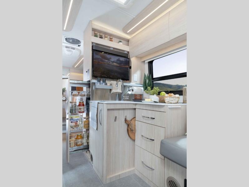 With any Leisure Travel Wonder Class B+ gas motorhome, the construction includes vacuum bonded aluminum framed insulated contoured sidewalls and a domed roof with fiberglass exterior, and a floor with composite exterior on a Ford Transit dual rear wheel chassis. Some highlights include the 16" heavy-duty forged aluminum alloy wheels, the auto high-beam headlamps, and the advance active safety features. The interior offers the SYNC 4 navigation system, curved soft close overhead cabinetry doors with hidden catches, full extension ball bearing soft close drawer tracks, LED aisle lighting and above cabinet hidden accent lights, and tile look vinyl flooring throughout for style and easy care. Optional AWD is available, along with the optional 60th Anniversary Edition decor and exterior color, solar panels for off-grid capability, a battery upgrade, and more!