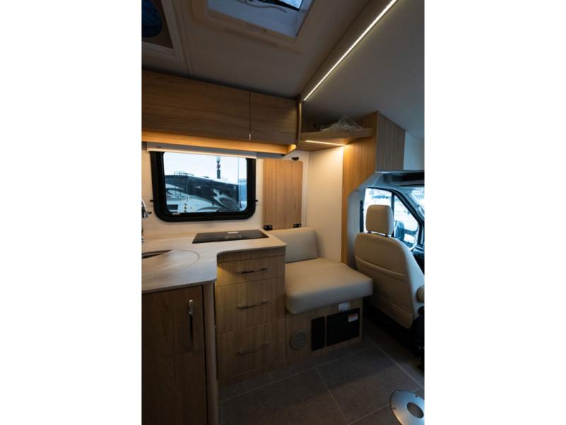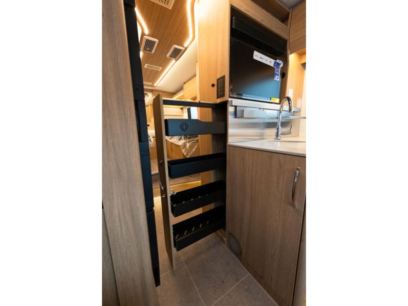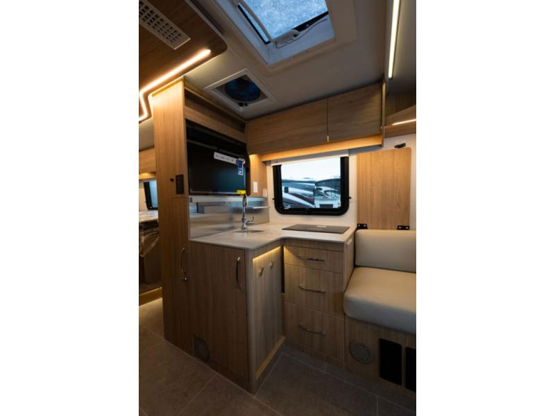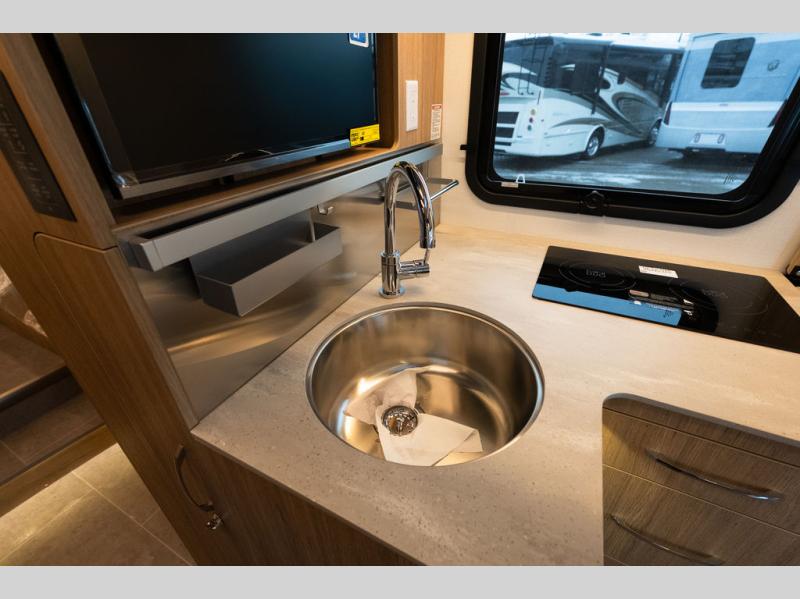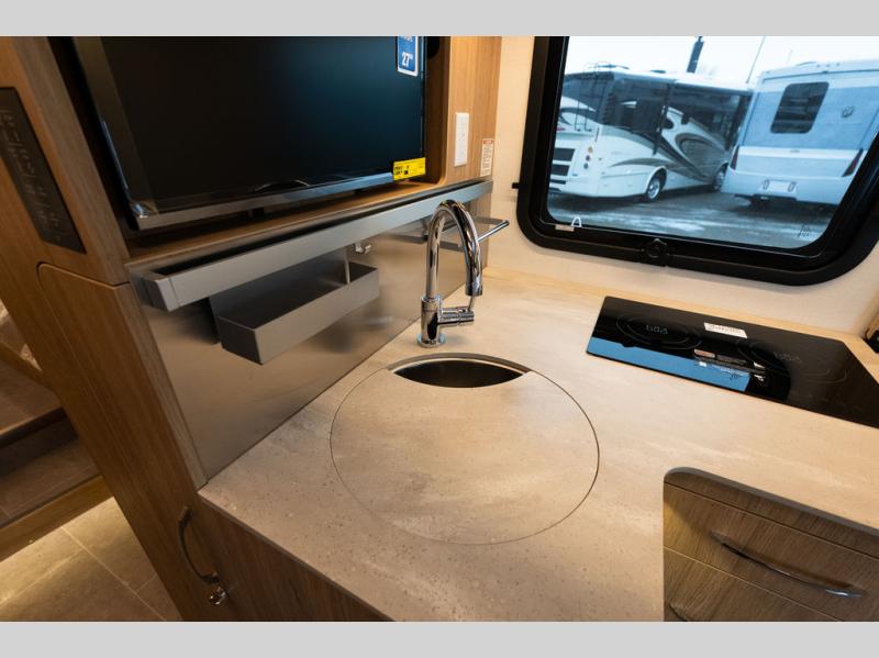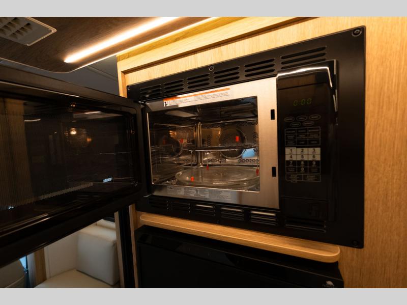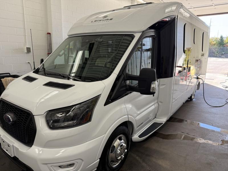 With any Leisure Travel Wonder Class B+ gas motorhome, the construction includes vacuum bonded aluminum framed insulated contoured sidewalls and a domed roof with fiberglass exterior, and a floor with composite exterior on a Ford Transit dual rear wheel chassis. Some highlights include the 16" heavy-duty forged aluminum alloy wheels, the auto high-beam headlamps, and the advance active safety features. The interior offers the SYNC 4 navigation system, curved soft close overhead cabinetry doors with hidden catches, full extension ball bearing soft close drawer tracks, LED aisle lighting and above cabinet hidden accent lights, and tile look vinyl flooring throughout for style and easy care. Optional AWD is available, along with the optional 60th Anniversary Edition decor and exterior color, solar panels for off-grid capability, a battery upgrade, and more!