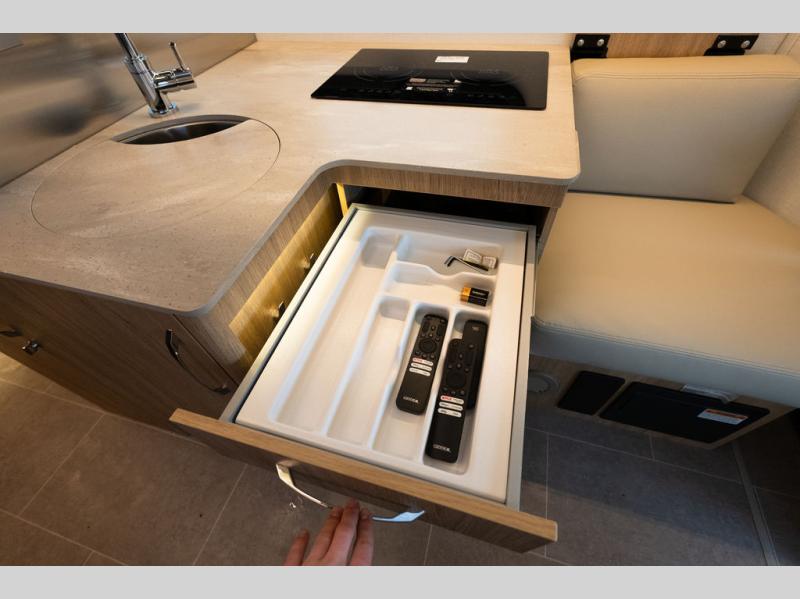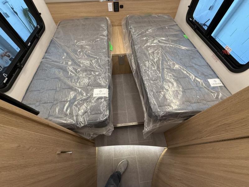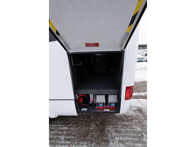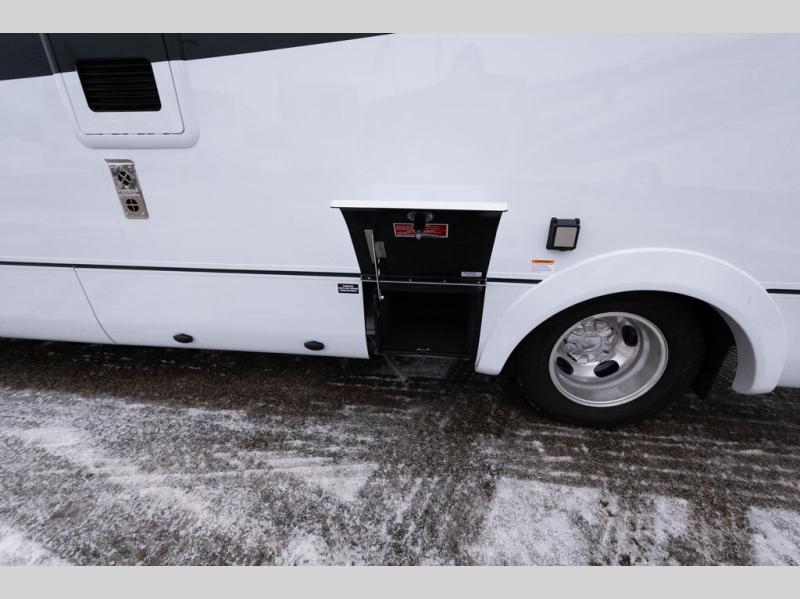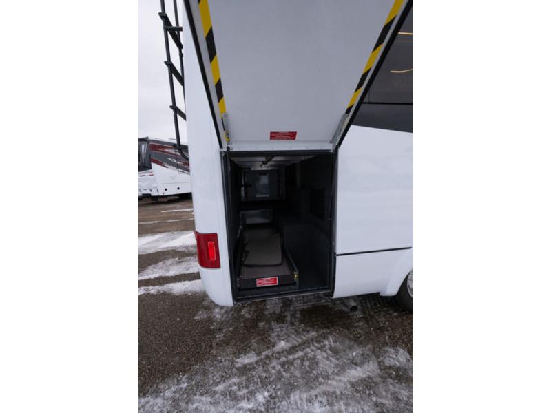 The adventurous type will love this coach with its large pass-through exterior garage-style storage with a bicycle/cargo slide that allows you to fit two full-sized bicycles and much more for fun outdoor adventures on the go. The separate rear bedroom provides convertible twin beds with easy access to the separate lavatory across from the enclosed shower, or you can make the twins into one 64" x 76" bed. The large galley offers a flip-down extension for more space for your drinks, dishes and such, a convection microwave oven, and a flush mount LP cooktop with a hinged glass cover. There is also a garbage can to keep everything tidy, and a double door, a compressor refrigerator/freezer, plus an accessory rail.