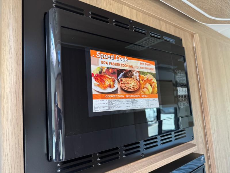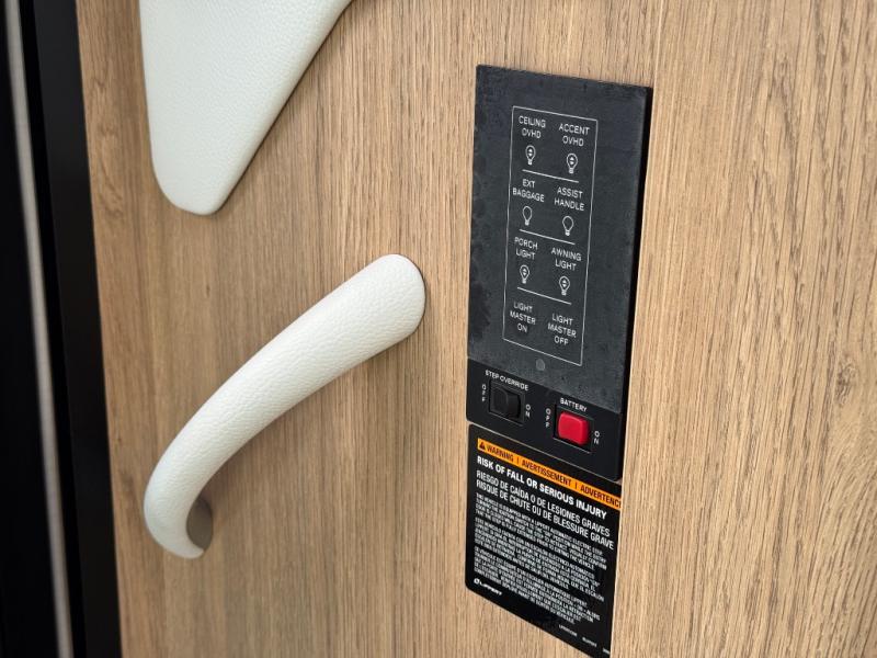 The adventurous type will love this coach with its large pass-through exterior garage-style storage with a bicycle/cargo slide that allows you to fit two full-sized bicycles and much more for fun outdoor adventures on the go. The separate rear bedroom provides convertible twin beds with easy access to the separate lavatory across from the enclosed shower, or you can make the twins into one 64" x 76" bed. The large galley offers a flip-down extension for more space for your drinks, dishes and such, a convection microwave oven, and a flush mount LP cooktop with a hinged glass cover. There is also a garbage can to keep everything tidy, and a double door, a compressor refrigerator/freezer, plus an accessory rail.