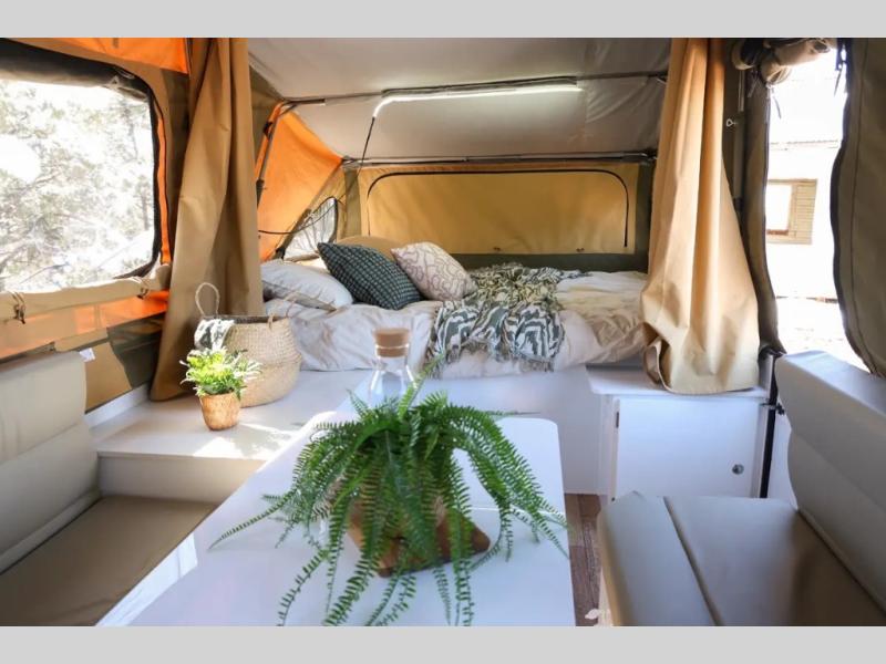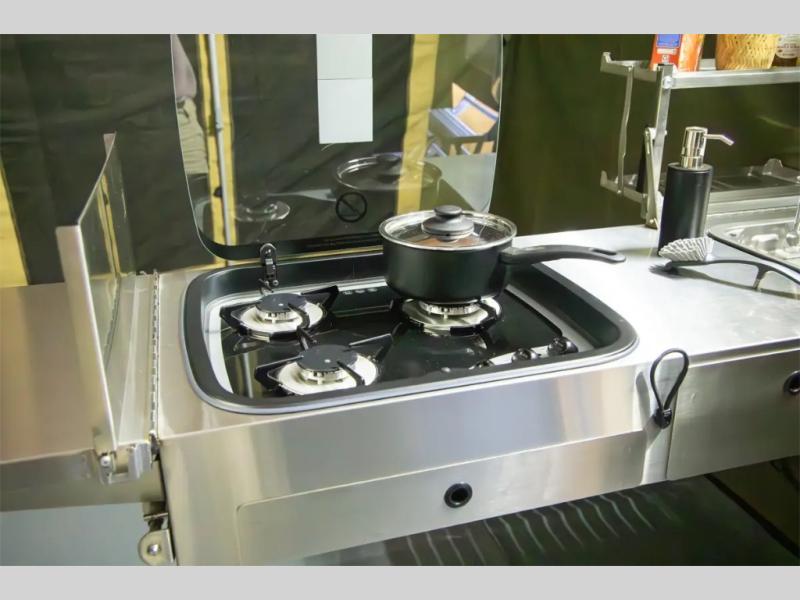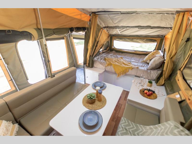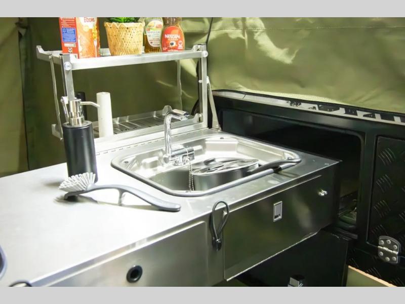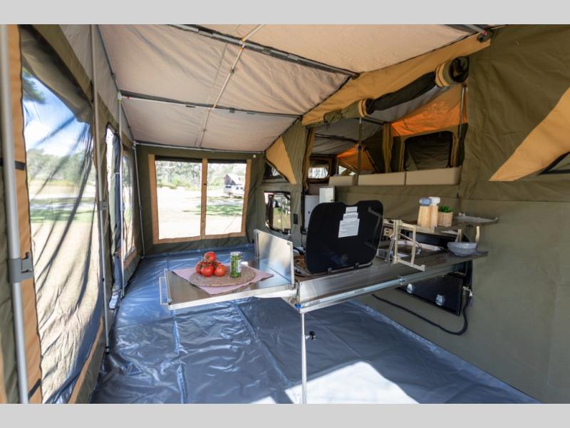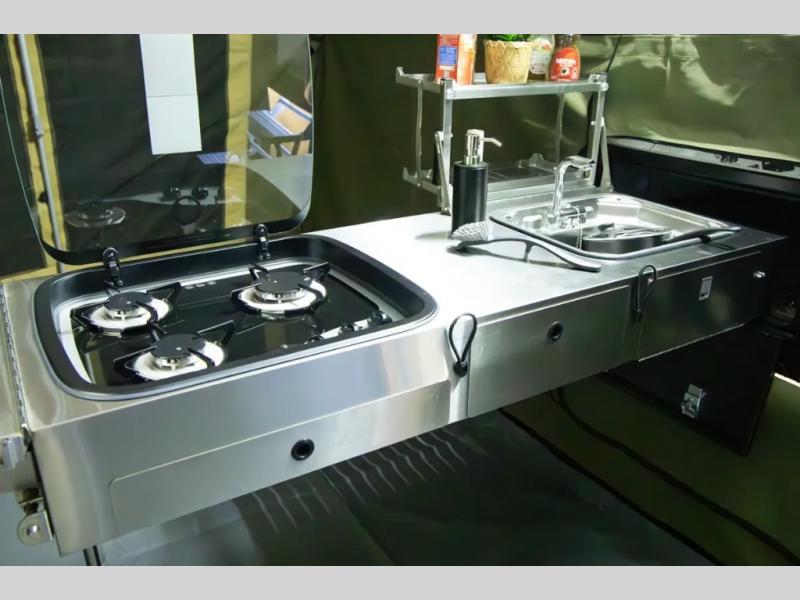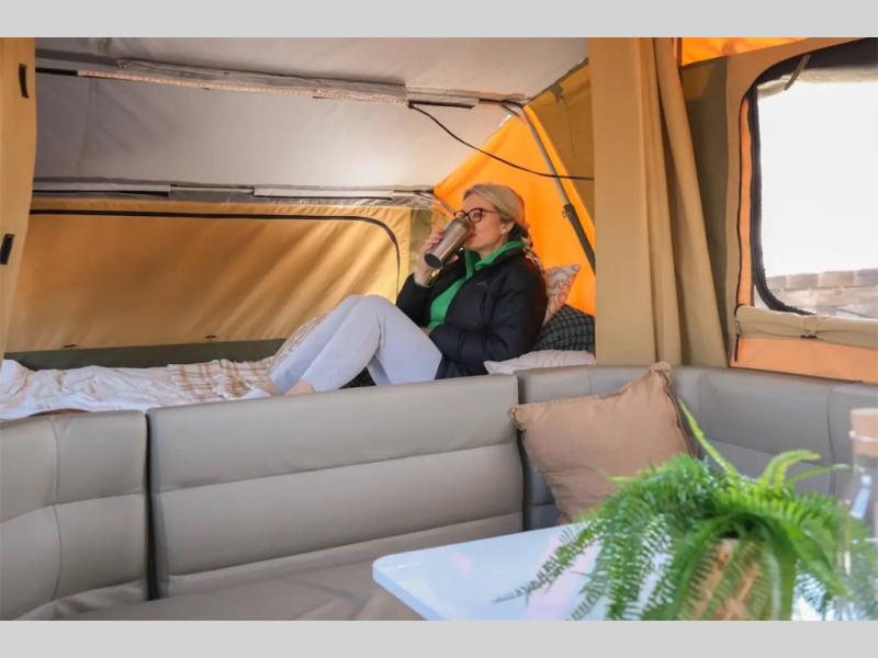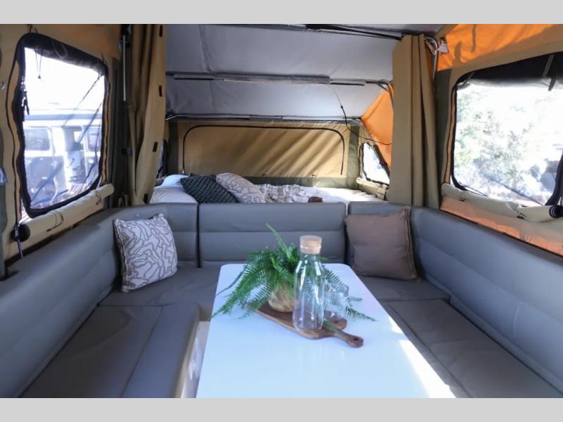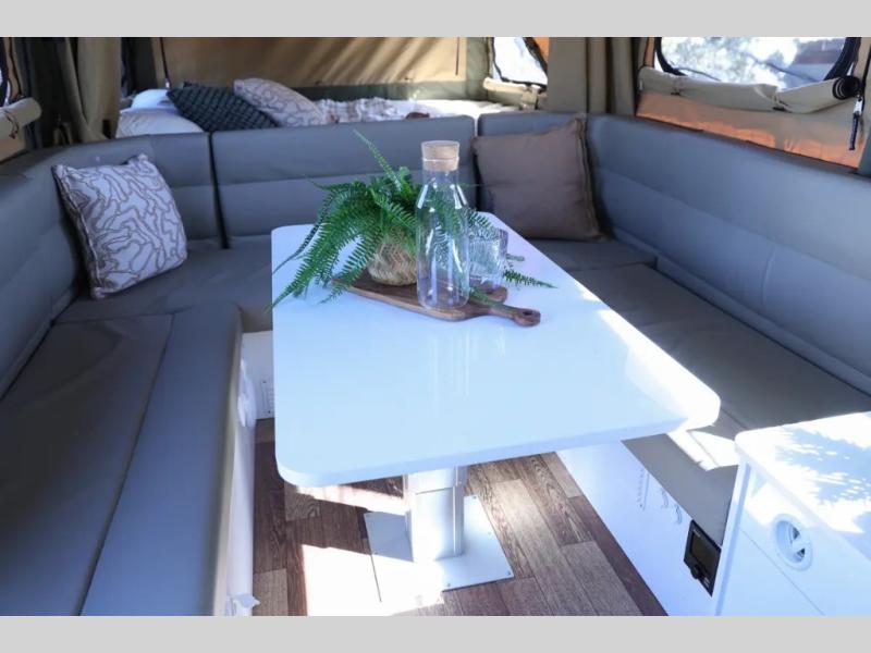 Off-grid comfort is possible in this pop-up camper for six! There are three storage slide trays to unload when you get to camp, then you can set up the integrated tent and fully enclosed annex. The exterior slide out kitchen includes a Thetford stainless steel three burner cooktop, a sink, and a refrigerator slide to keep your food fresh. This unit also includes a tent attached PVC ensuite tent and external hot/cold shower, providing you with a private space to freshen up each day. And the two tent end beds and U-shaped convertible lounge will let you sleep six campers total!