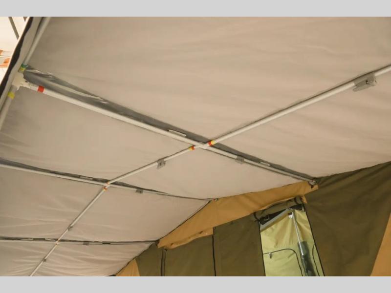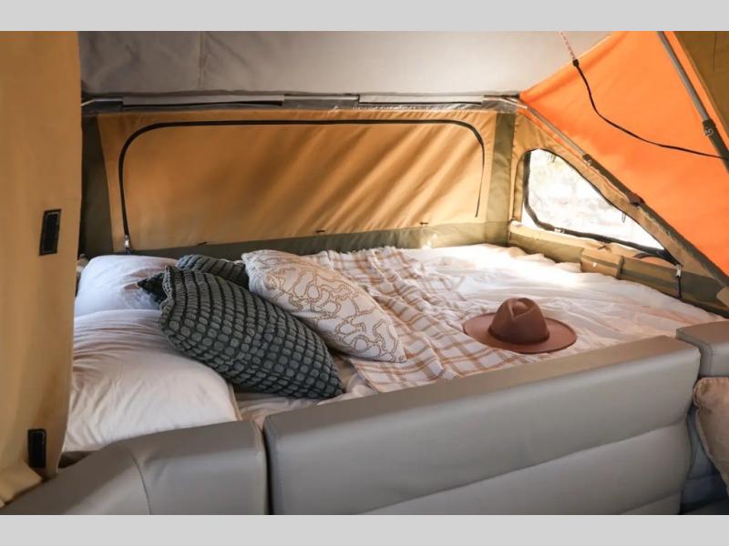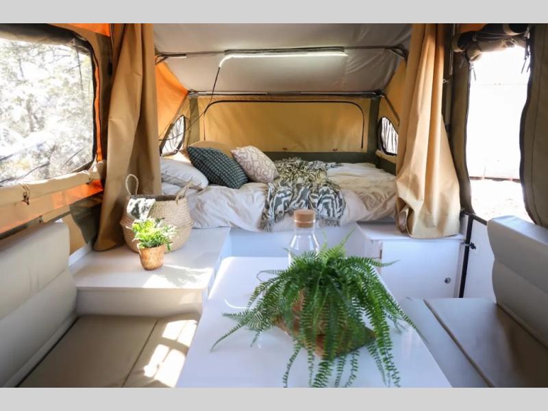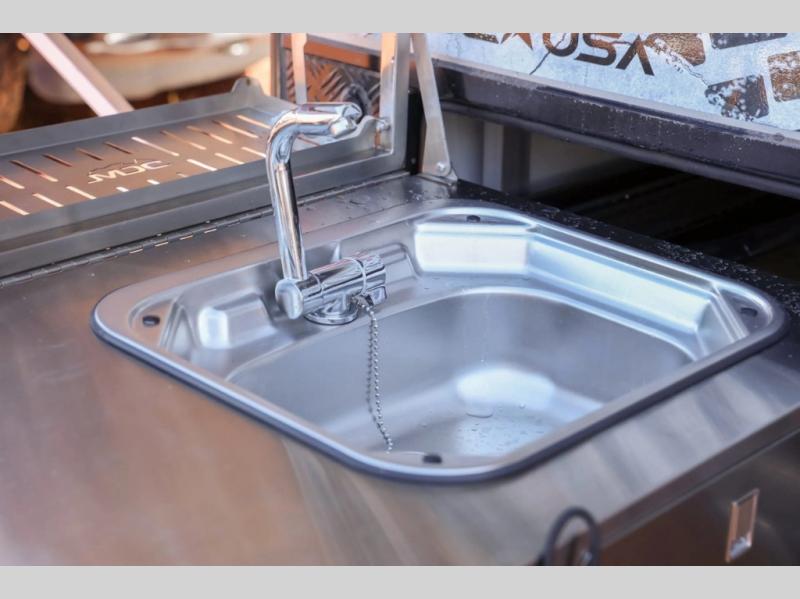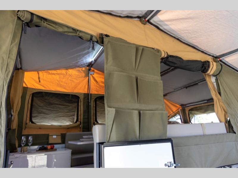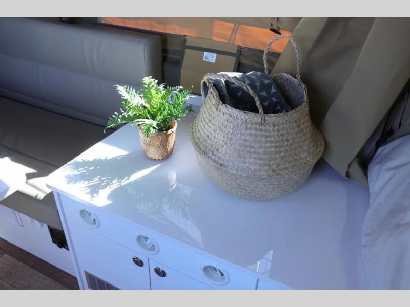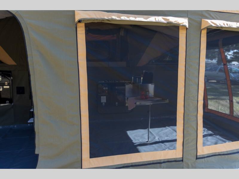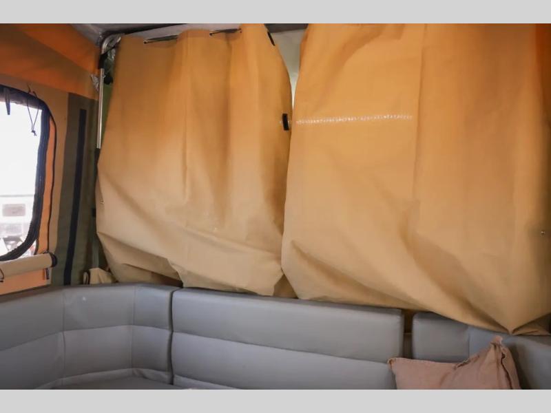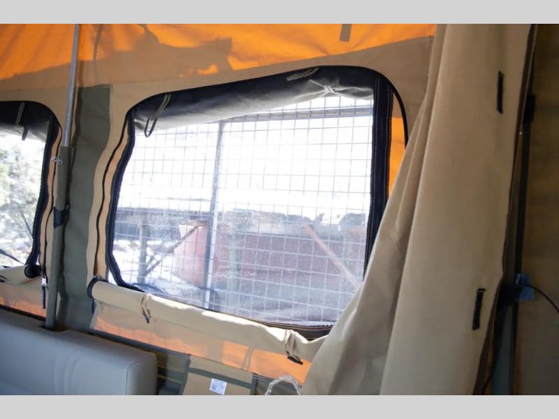 Off-grid comfort is possible in this pop-up camper for six! There are three storage slide trays to unload when you get to camp, then you can set up the integrated tent and fully enclosed annex. The exterior slide out kitchen includes a Thetford stainless steel three burner cooktop, a sink, and a refrigerator slide to keep your food fresh. This unit also includes a tent attached PVC ensuite tent and external hot/cold shower, providing you with a private space to freshen up each day. And the two tent end beds and U-shaped convertible lounge will let you sleep six campers total!