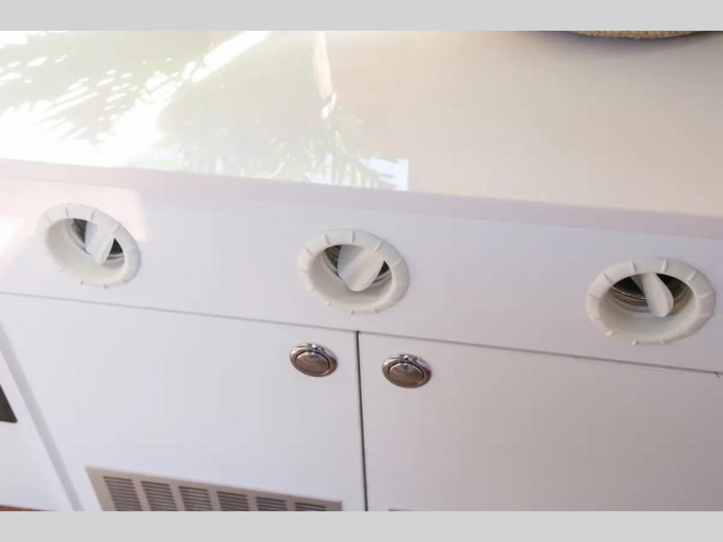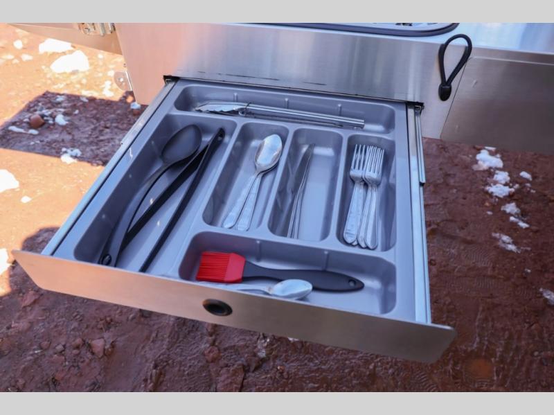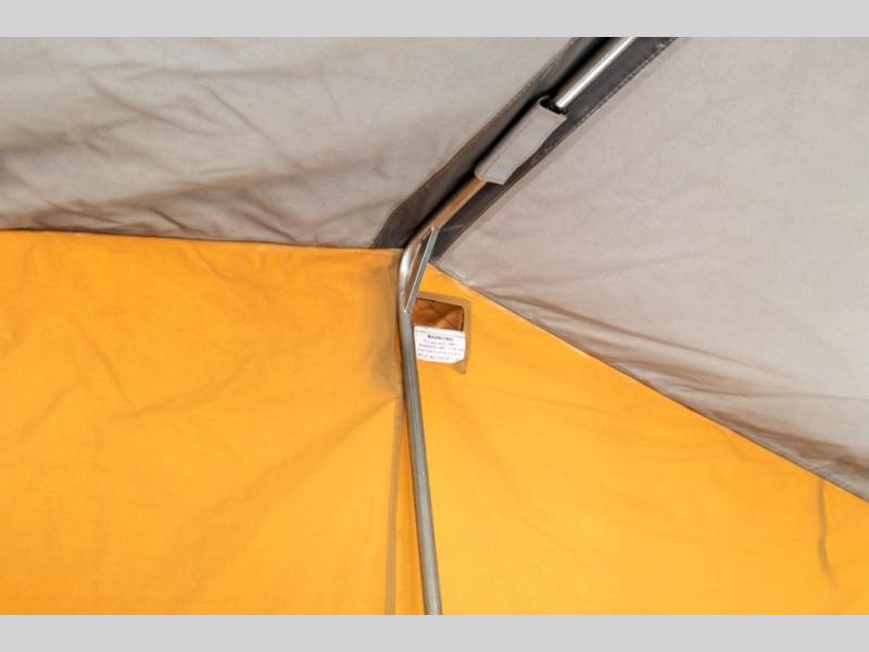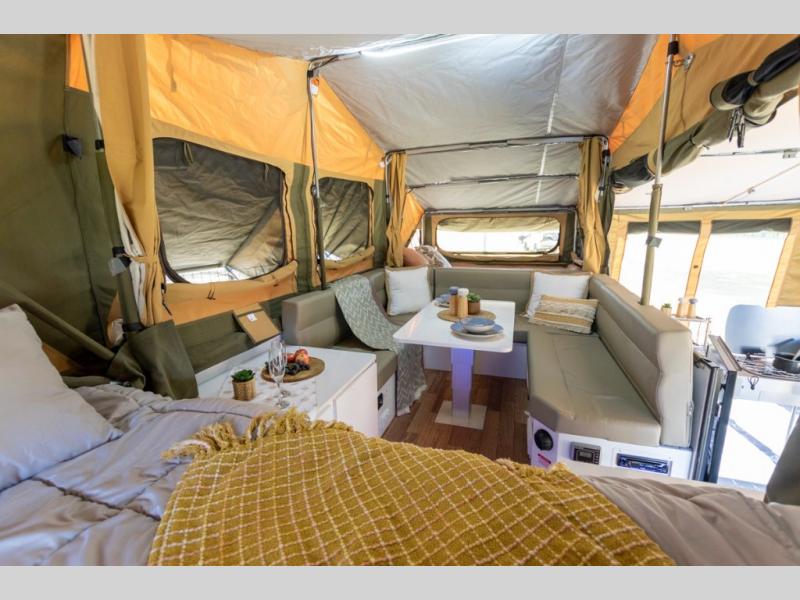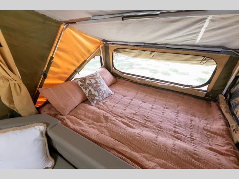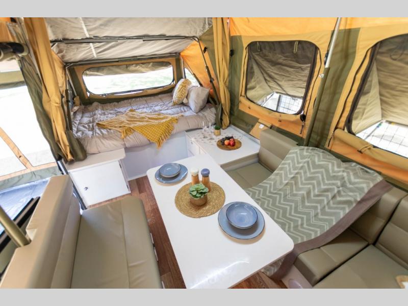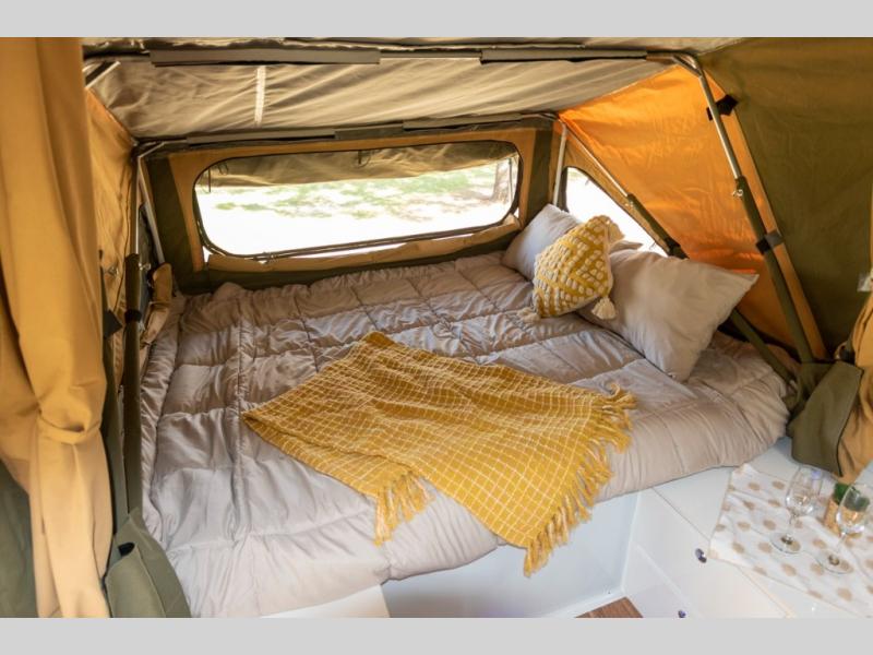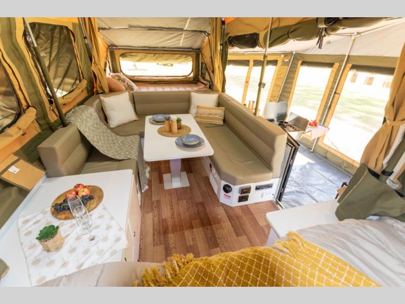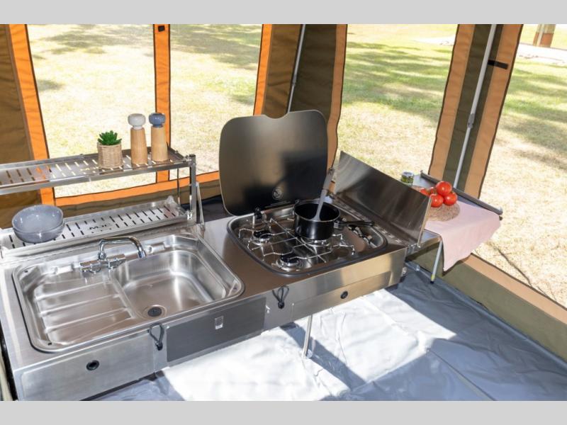 Off-grid comfort is possible in this pop-up camper for six! There are three storage slide trays to unload when you get to camp, then you can set up the integrated tent and fully enclosed annex. The exterior slide out kitchen includes a Thetford stainless steel three burner cooktop, a sink, and a refrigerator slide to keep your food fresh. This unit also includes a tent attached PVC ensuite tent and external hot/cold shower, providing you with a private space to freshen up each day. And the two tent end beds and U-shaped convertible lounge will let you sleep six campers total!