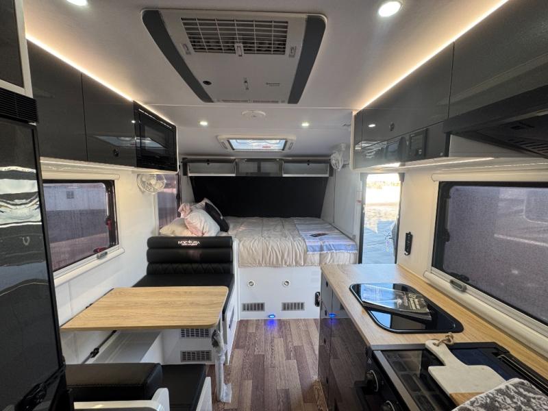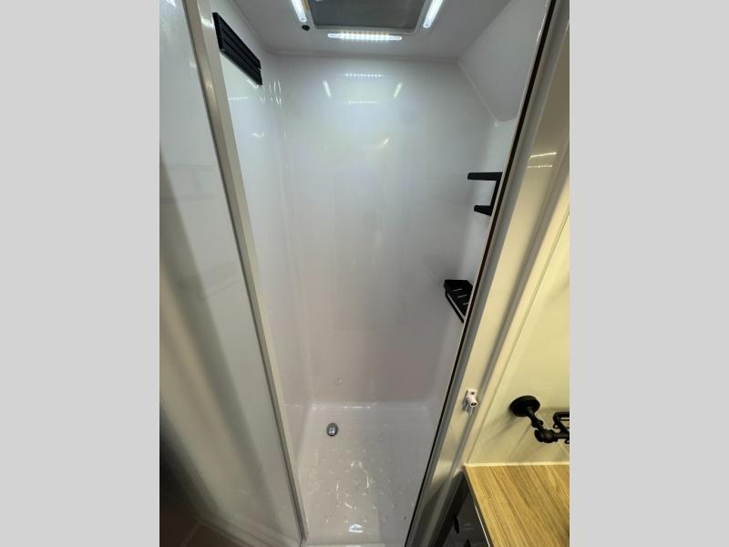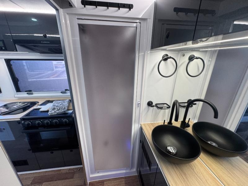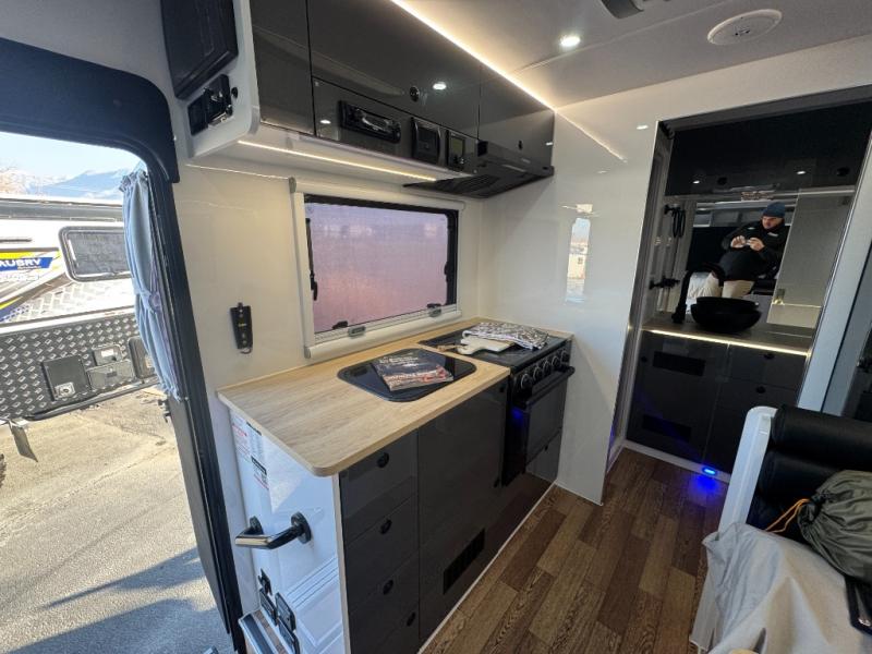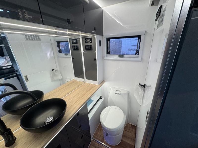 This Off-Grid Extreme lets you go off the beaten path for longer periods of time thanks to the Renogy energy system and the impressive solar power system! You will love that you can choose to cook inside or out with a full internal kitchen that features a three-burner cooktop and sink, plus refrigerator and plenty of storage. You will also appreciate having the choice on a nice day to cook outside using the kitchen slide featuring a stainless steel three-burner cooktop and sink, and pull-out drawers for your silverware and other necessities all located under the electric power awning for added protection. The awning can also be converted into an enclosed annex with the awning wall and floor kit which is great for when the weather isn't cooperating. This unit also features a dry bath with glass vessel bowl sink, toilet and shower, plus lots of storage for towels and bath necessities as well.