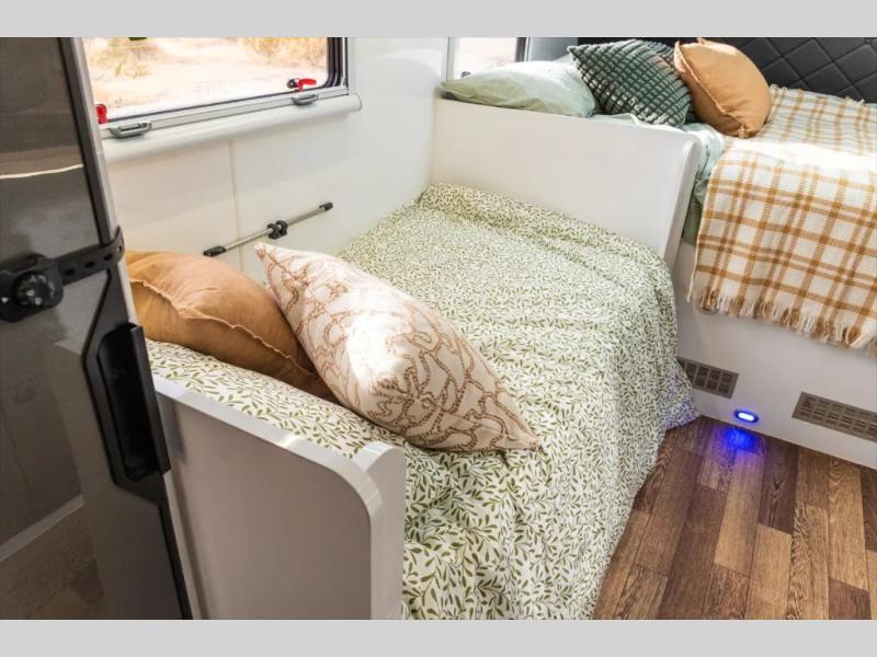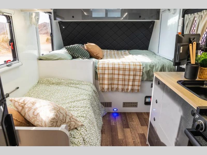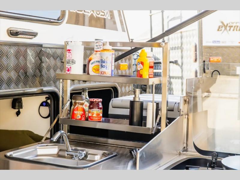 This Off-Grid Extreme lets you go off the beaten path for longer periods of time thanks to the Renogy energy system and the impressive solar power system! You will love that you can choose to cook inside or out with a full internal kitchen that features a three-burner cooktop and sink, plus refrigerator and plenty of storage. You will also appreciate having the choice on a nice day to cook outside using the kitchen slide featuring a stainless steel three-burner cooktop and sink, and pull-out drawers for your silverware and other necessities all located under the electric power awning for added protection. The awning can also be converted into an enclosed annex with the awning wall and floor kit which is great for when the weather isn't cooperating. This unit also features a dry bath with glass vessel bowl sink, toilet and shower, plus lots of storage for towels and bath necessities as well.