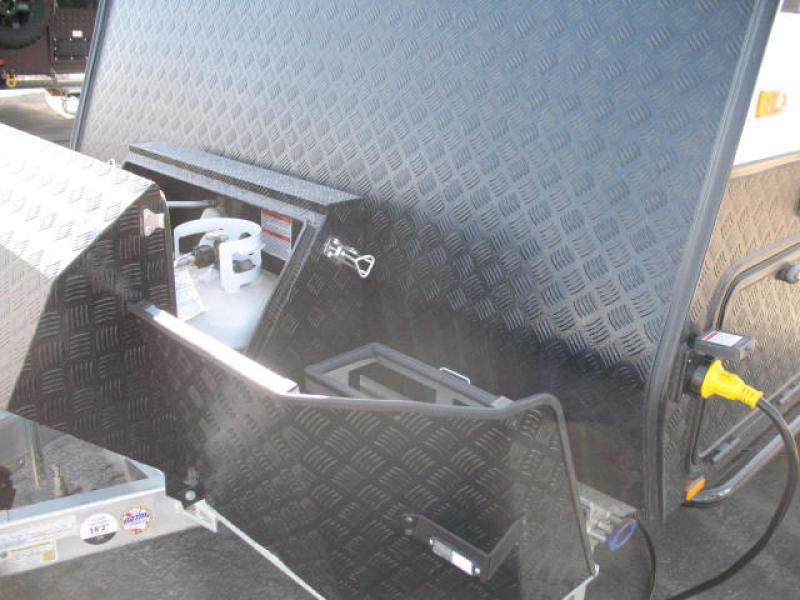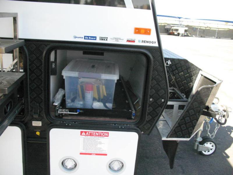 Go off the beaten path in this Off-Grid Extreme trailer! Don't let the compact design fool you; this unit is feature-packed with everything you need. There is an interior kitchen with a three burner propane cooktop and sink plus an exterior slide kitchen when the weather is nice out. The wet bath will provide a private space for you to freshen up each day, and there is even an exterior hot/cold shower with a wall-mounted shower tent for when you just want to rinse off quickly! You'll stay powered up by the internal and external outlets, the Renogy electrical system, and the impressive solar power system. This unit also includes a Cold Weather Pack design with water tank heating pads, a Truma VarioHeat 11,500 BTU/h furnace, dual pane windows and more features that will help extend your camping season!