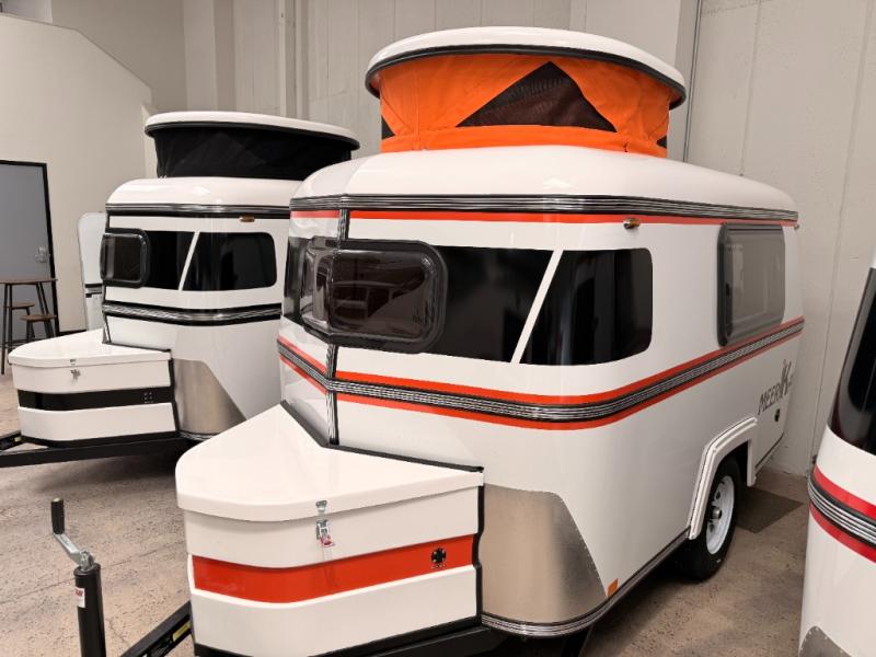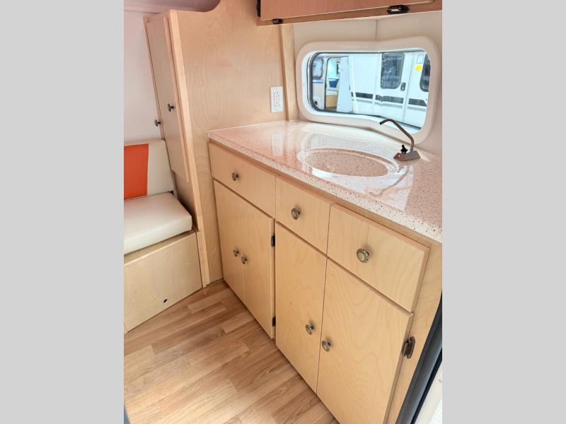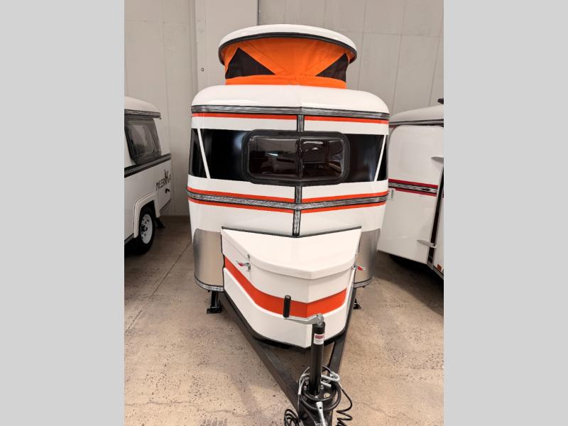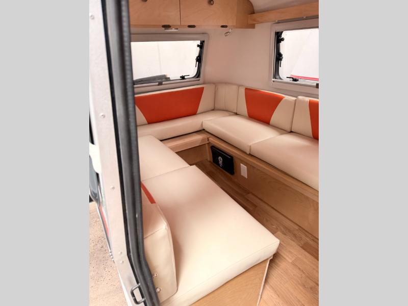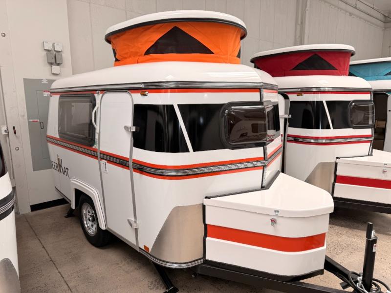 Bigger is not always better, and this little MeerKat will prove that to any interested camping couple that is looking to tow behind their everyday car. The MeerKat provides you a step up from tent camping where you can enjoy a dry place to sleep, eat, and store your things easily. And the included porta potty allows you to skip the public facilities in the middle of the night. The dinette table and wrap around seating can easily transform into a bed for a comfortable night's sleep. Three opening windows will allow you to enjoy fresh air circulating throughout both day and night. You will find under seating storage, plus several cabinets to tuck your things out of sight when not in use, and the front countertop provides a handy sink, plus a one burner camp stove is also available along with an icebox for your perishables. The MeerKat can easily be customized to suit your style of camping. You can add an optional awning, front storage box for more gear, a refrigerator, or induction cooktop, plus more. It's time to check this tiny camper out!