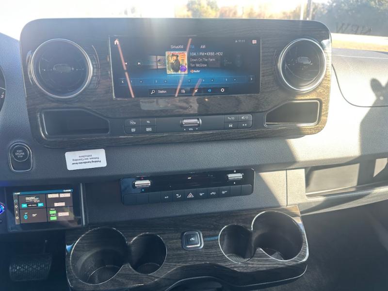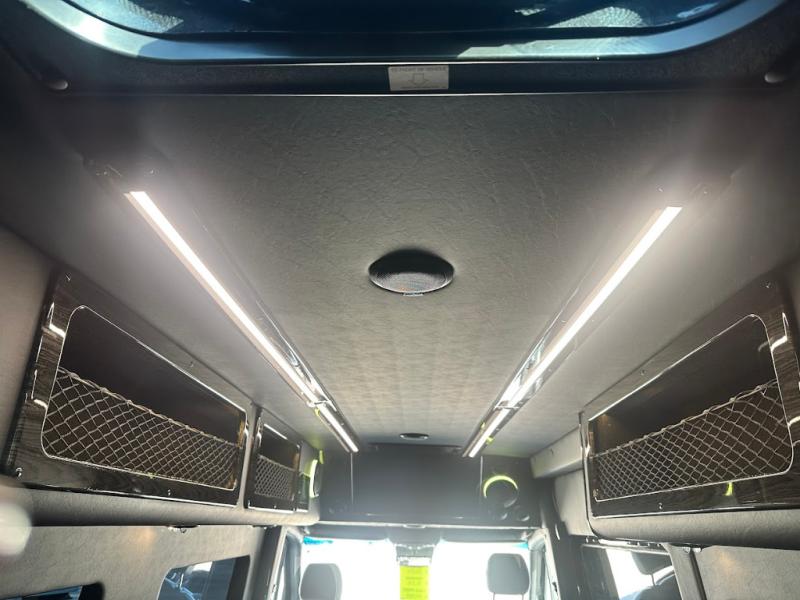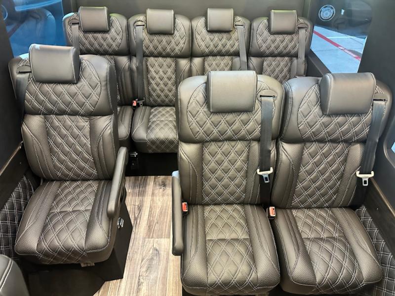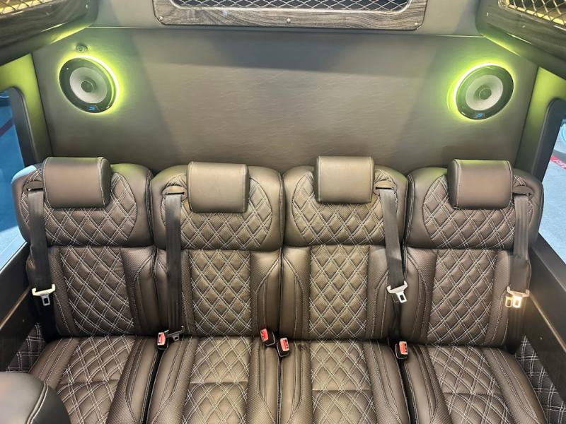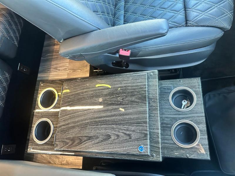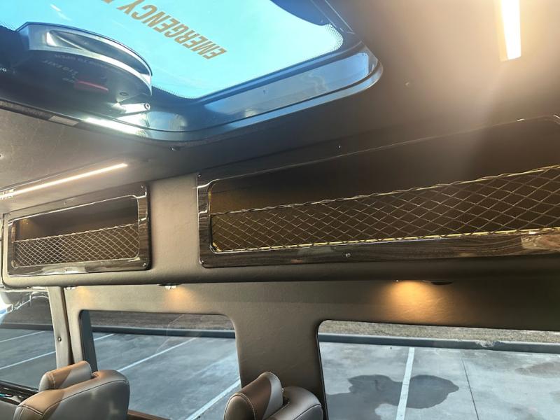 Step into a world of comfort with our automotive vinyl color-keyed walls and HD linoleum flooring that provide a stylish yet practical environment. The shuttle style seating package ensures ample space for passengers, while the driver and passenger deluxe seating offers superior comfort with a luxurious recover. Stay safe on the road with our seat belt package and enjoy a quiet ride thanks to the complete insulation package and interior sound deadening features. The bus is equipped with high-output rear air and heat, ensuring a comfortable climate regardless of the weather outside. Entertainment is at your fingertips with a 32" TV and speakers, perfect for movies or presentations. The bus also features rear speaker upgrades and overhead and floor courtesy lighting for a welcoming atmosphere. Each seat is equipped with cup holders and 110V outlets with USB chargers, allowing passengers to stay connected throughout the journey. Additional highlights include color-changing ceiling accent lights, dual rear clothes hangers, and overhead cabinets with netting and color-changing lights to keep your belongings organized and secure. The lighted rear luggage area and rear wall with storage shelf provide ample space for all your travel essentials.