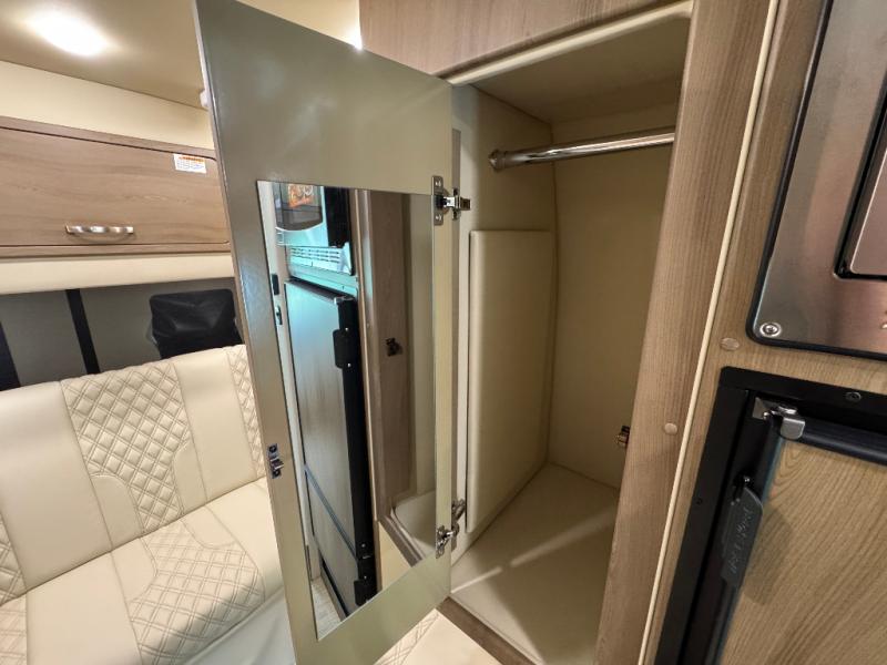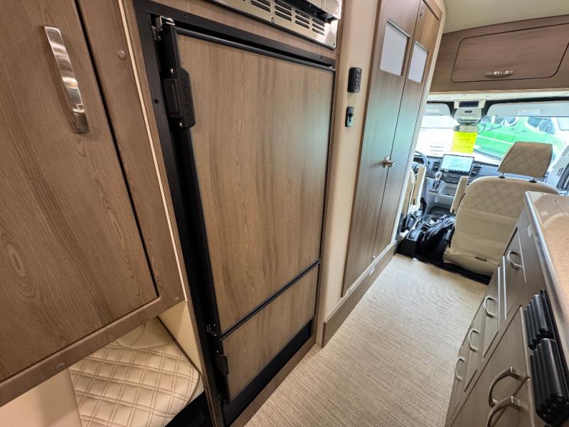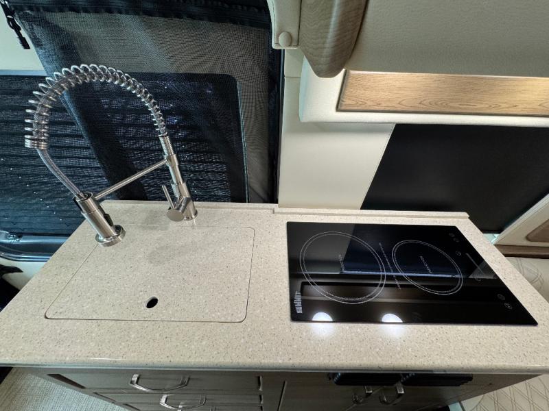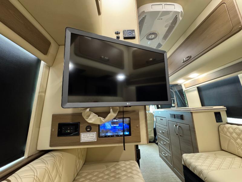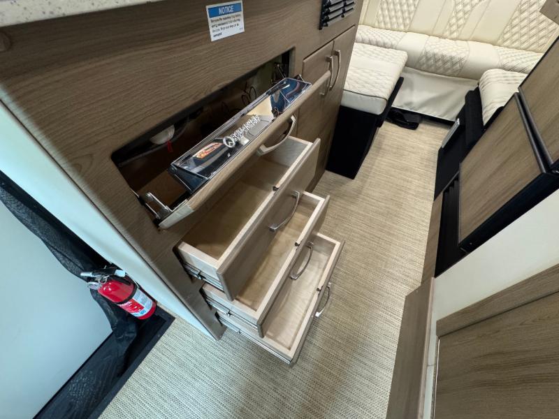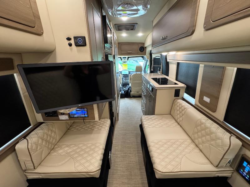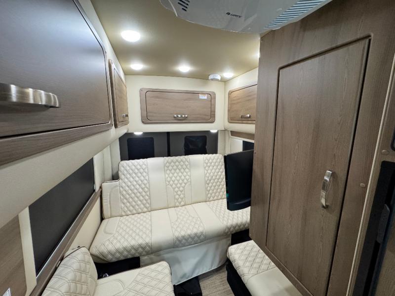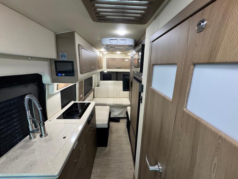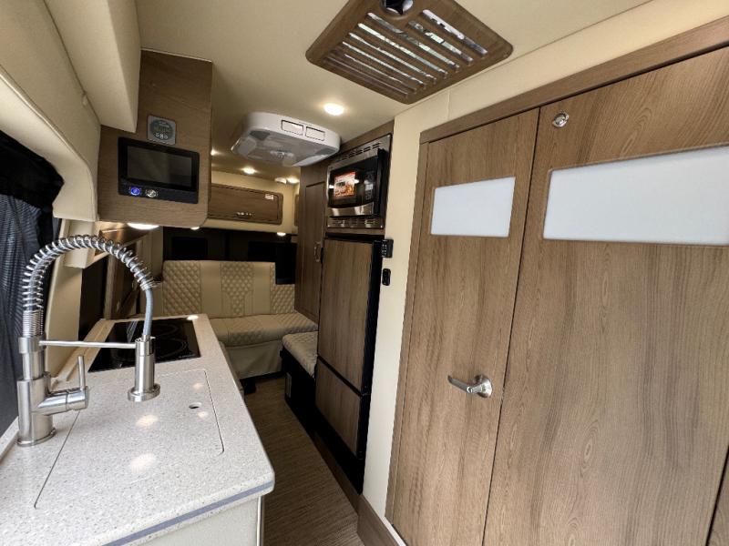 Each Passage Class B gasoline motorhome begins with the safety and performance engineering of the Ford Transit and includes luxury and convenience throughout. The Suburban water heater offers instant hot water on demand, the convection microwave and induction cooktop allow you to make meals whenever you like, and the 12 Volt/110 Volt refrigerator allows you to store cold items while traveling. The style and comfort of the hand-stitched leather seating, polished wood veneer cabinets, and solid surface countertops will impress you every time you take to the road. You also have the convenience of technology with a 100-Watt rooftop solar charging system, an HDMI input, and a location prepped for satellite TV and Wi-Fi!
