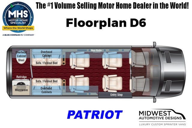 MSRP $248,325. New 2026 Midwest Automotive Design Patriot Cruiser D6. This luxury Class B RV measures approximately 24 feet 3 inches in length with the 170EXT sprinter chassis which features the powerful 2.0L High-Output Diesel engine. Options include all season tires & black rims, seat heat & massage, 200Ah Lithium batteries, 4 camera viewing system, cellular internet router & apple TV, stainless exterior chrome decor package, all new azure seat design and alpine status with front alpine cabin speakers. Shop a great selection of Mercedes Sprinter diesel Class B RVs all at 1 location! Choose from Midwest Automotive Designs Patriot – Patriot Cruiser – Forest River OGV V RV – V Cruise – Thor Motor Coach Tranquility – Entegra Coach Launch and more. We also buy and sell quality pre-owned models such as Airstream Interstate – Atlas – Jayco Terrain – Tiffin GH1 – Winnebago Revel – Adventure Wagon – Pleasure Way Plateau – Ascent – Roadtrek – Leisure Travel Wonder – Unity - Coachmen Galleria – Thor Sanctuary and much more. Visit MHSRV.com for our complete line-up and the sale prices that have made us the #1 volume selling motor home dealership in the world 12 years in a row! For additional details on this unit and our entire inventory including brochures, window sticker, videos, photos, reviews & testimonials as well as additional information about Motor Home Specialist and our manufacturers please visit us at MHSRV.com or call 800-335-6054. At Motor Home Specialist, we DO NOT charge any prep or orientation fees like you will find at other dealerships. All sale prices include a 200-point inspection, interior & exterior wash, detail service and a fully automated high-pressure rain booth test and coach wash that is a standout service unlike that of any other in the industry. You will also receive a thorough coach orientation with an MHSRV technician, a night stay in our delivery park featuring landscaped and covered pads with full hook-ups and much more! Read Thousands upon Thousands of 5-Star Reviews at MHSRV.com and See What They Had to Say About Their Experience at Motor Home Specialist. WHY PAY MORE? WHY SETTLE FOR LESS?
