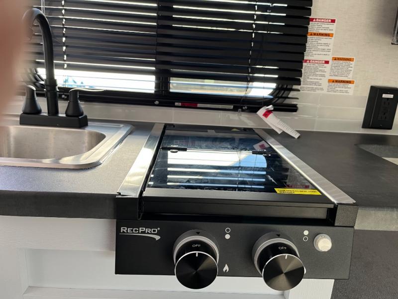If you're looking for a teardrop trailer with a little more space, check out this Big Buggy BB14! There is a front U-shaped dinette that can convert to cozy sleeping space, a two burner stove, plus a large 12V refrigerator. You can clean up each day in the wet bath that includes a two way bath vent fan plus a Dometic toilet. The exterior baggage door will keep all your gear secure, and the torsion axle will provide smooth towing from home to campground.