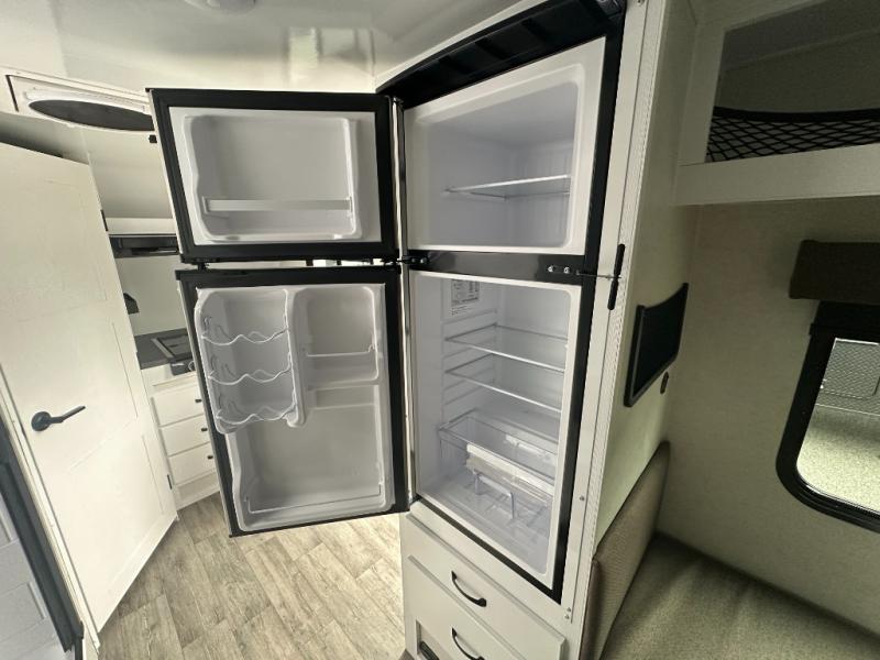 You'll love camping in this spacious trailer that can sleep up to three people. There is a two-burner stove with a cover so you can cook meals and enjoy extra counter space when you need it. The large refrigerator/freezer will let you keep your food fresh, and the stainless-steel sink will make clean up easier than ever. The dinette/bed will give you a place to dine together, and you're sure to appreciate the flex-bed system that gives you the option for a 78" x 83" bed, two twin-size beds, or a full-size bed! This trailer also includes a dry bathroom, a feature usually unheard of in teardrop trailers!