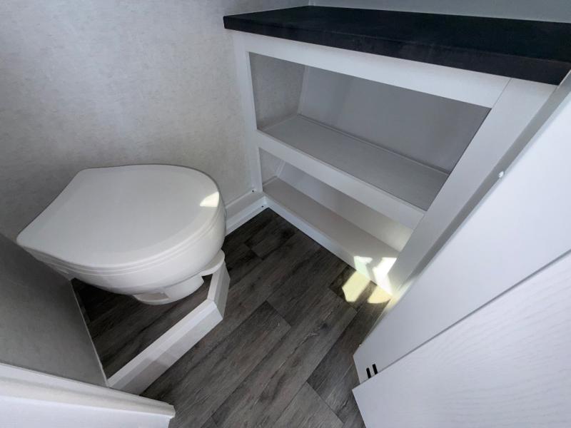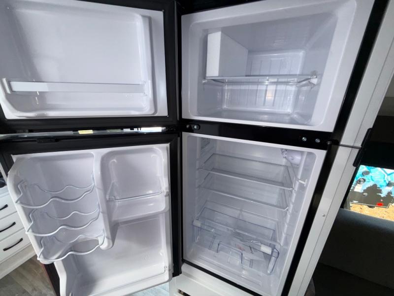 You'll love camping in this spacious trailer that can sleep up to three people. There is a two-burner stove with a cover so you can cook meals and enjoy extra counter space when you need it. The large refrigerator/freezer will let you keep your food fresh, and the stainless-steel sink will make clean up easier than ever. The dinette/bed will give you a place to dine together, and you're sure to appreciate the flex-bed system that gives you the option for a 78" x 83" bed, two twin-size beds, or a full-size bed! This trailer also includes a dry bathroom, a feature usually unheard of in teardrop trailers!