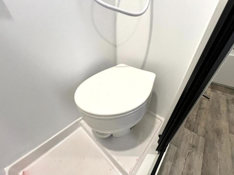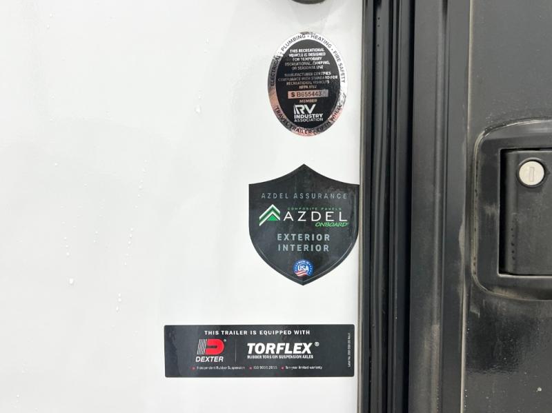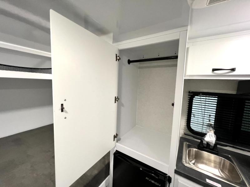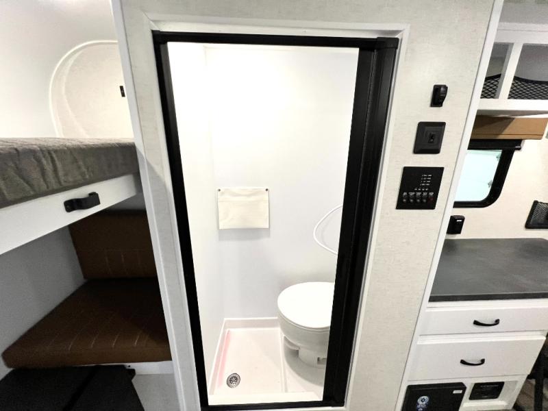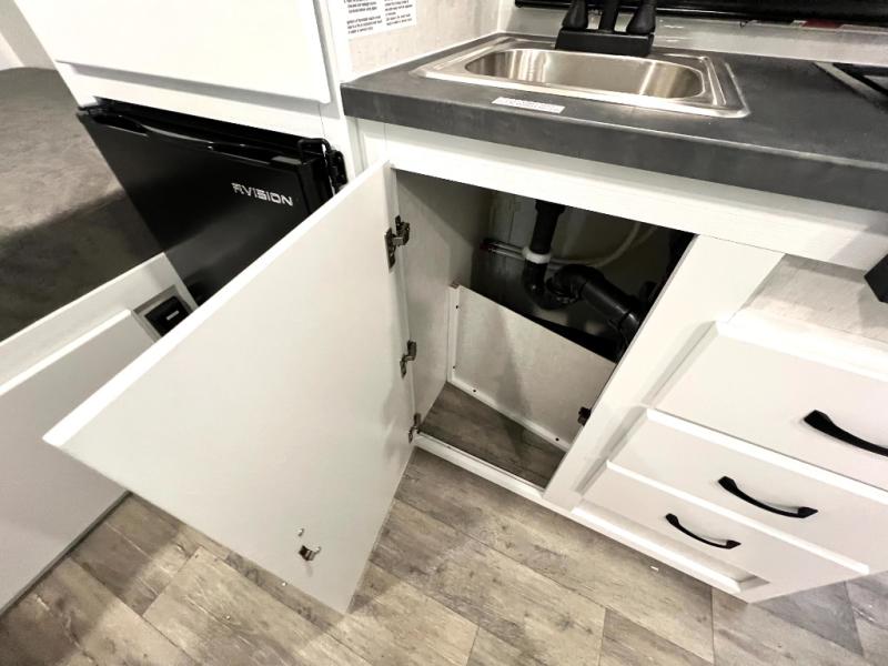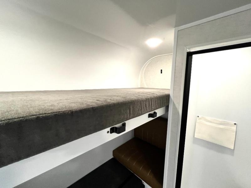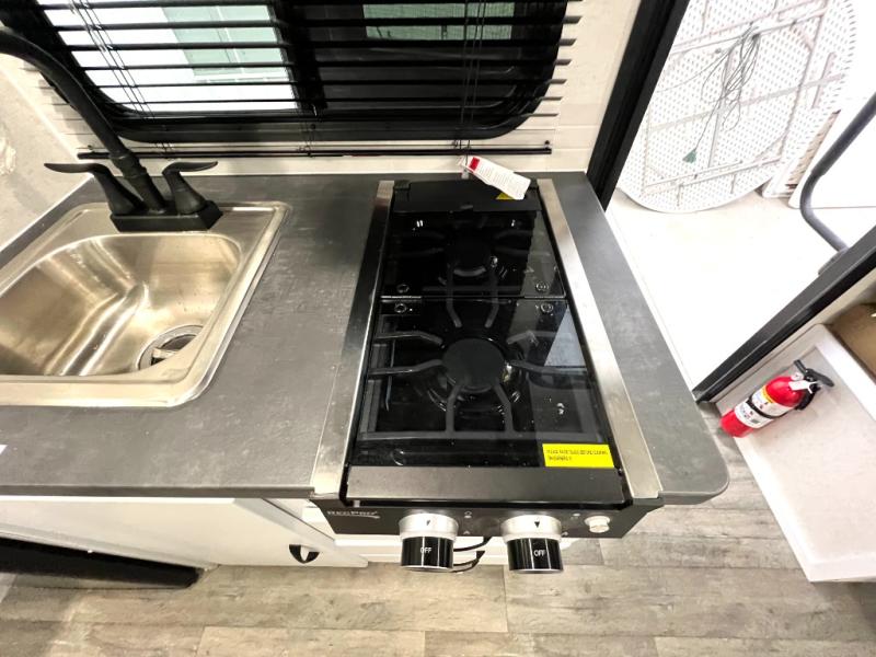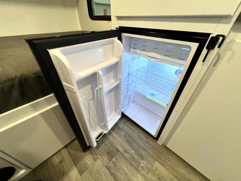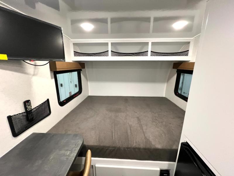 If you're looking for a lightweight trailer with a little more comfort, take a look at this one! There is a 60" x 77" bed to sleep on each night, along with a booth dinette that converts to a 78" x 30" bed and an upper 78" x 27" bunk, allowing you to sleep up to five! The kitchen includes a two burner stove, countertop and 12V refrigerator to keep food fresh. This unit also features four side windows, black roller shades, and a desk with desk drawers if you need to get some work done.