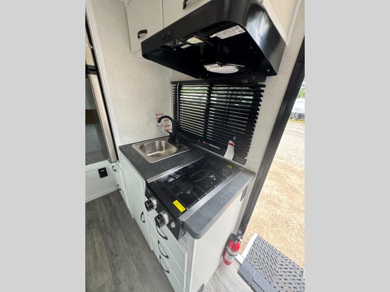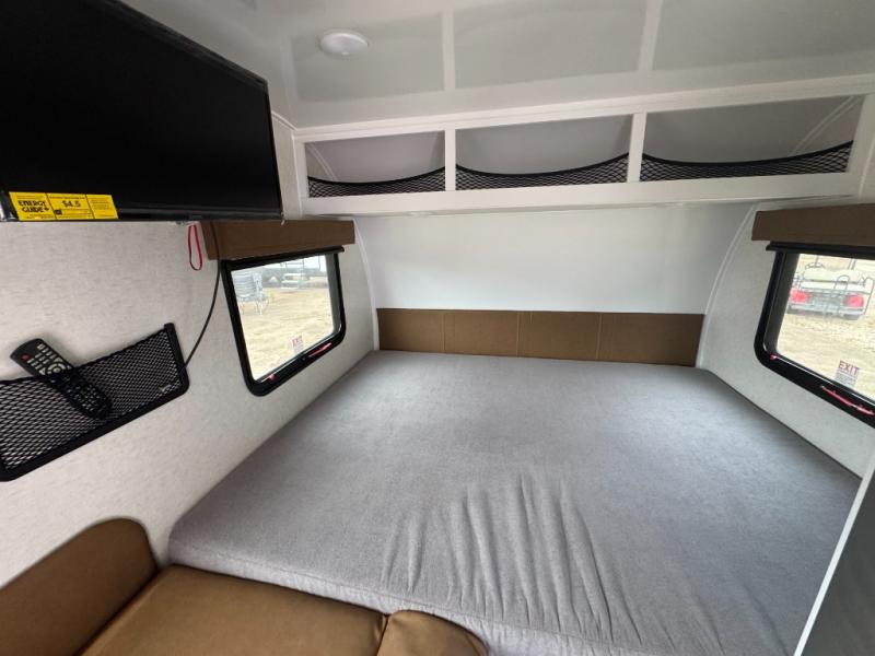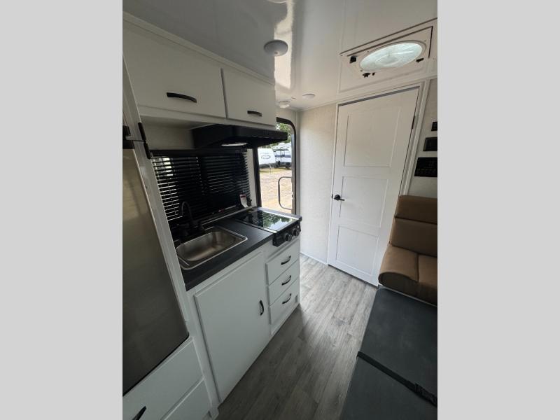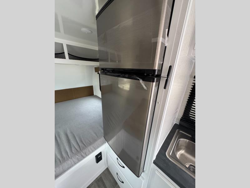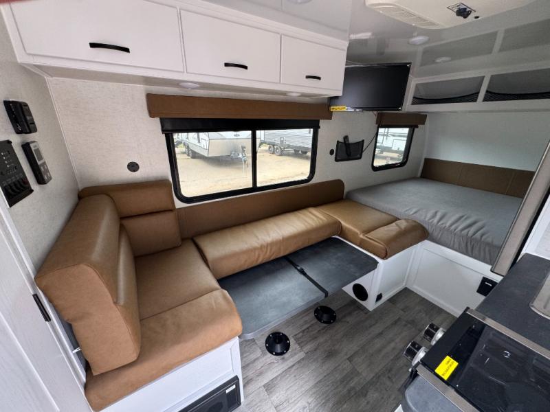 This unit will feel just like home with its full dry bath, full kitchen amenities, and a comfortable 60" x 77" bed. There is also a U-shaped dinette that will convert to an 84" x 34" sleeping space for guests. The 32" x 32" bath skylight will give more natural lighting and more standing room. A dinette overhead cabinet will keep your things tucked out of the way, and the exterior baggage door will be perfect for hiking gear!