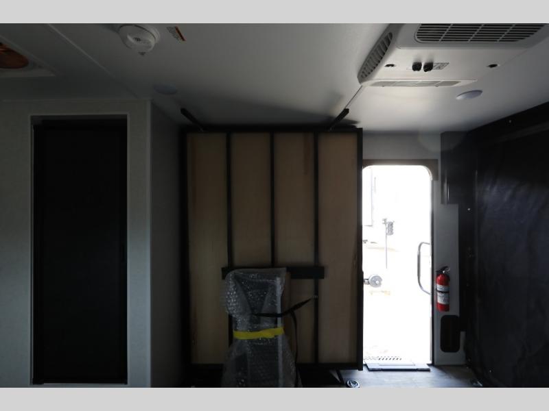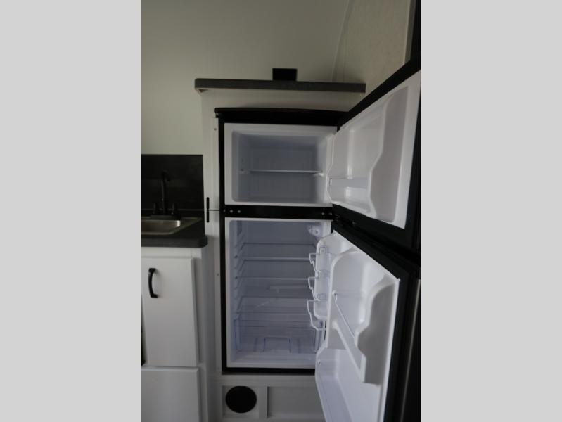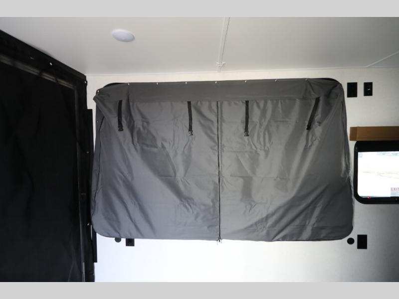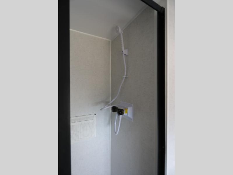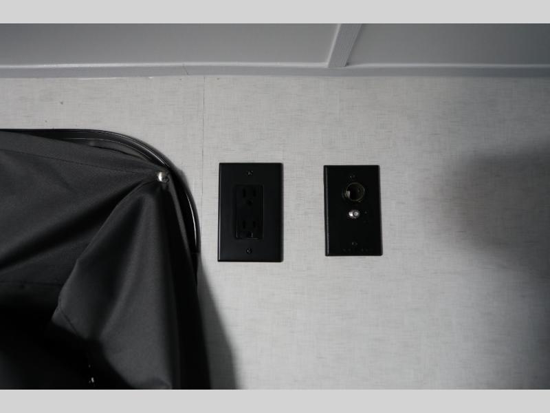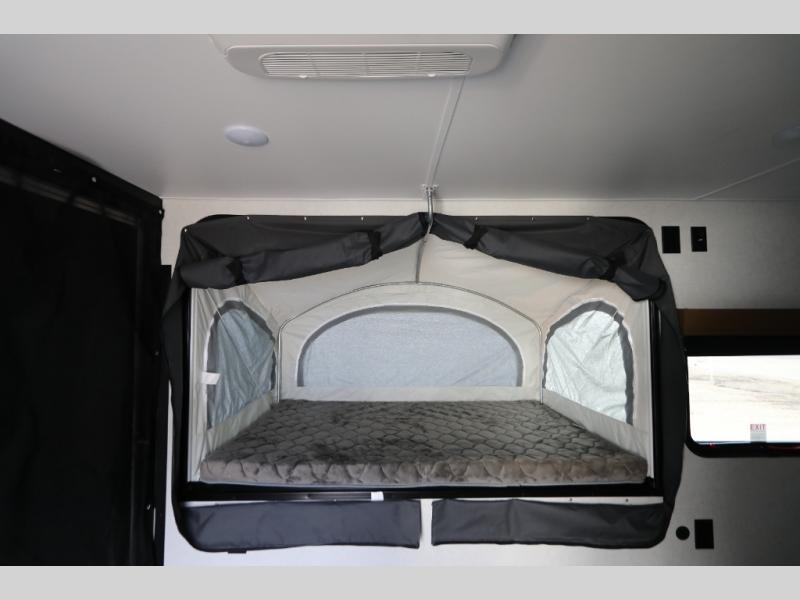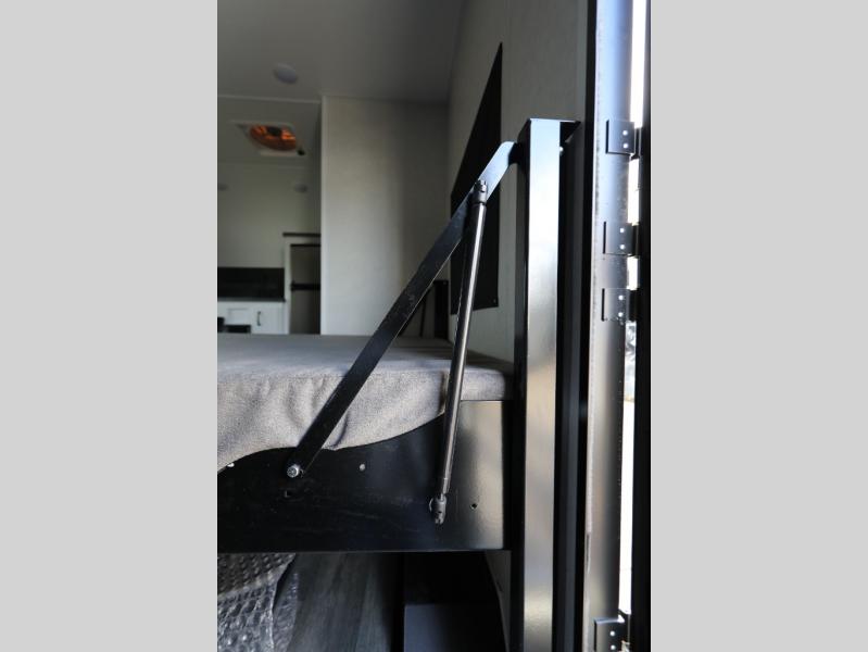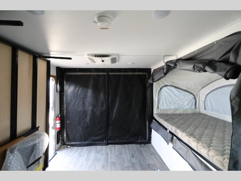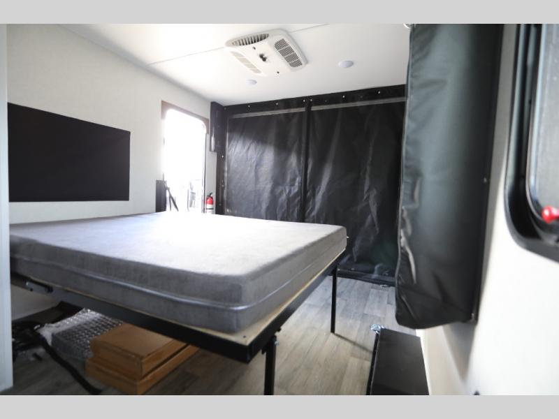 Load up the kayaks or dirt bikes for fun weekends in this toy hauler! Once you've unloaded your toys using the ramp door, you can start lunch in the front corner kitchen that includes a two-burner stove, a 12V refrigerator, and a stainless-steel sink for easy clean up. Speaking of cleaning up, the dry bath is also up front that includes a separate shower and Thetford toilet. And the 50" x 74" Murphy-style bed and side pop-out tent will provide comfy sleeping spaces when you're ready to call it a night!