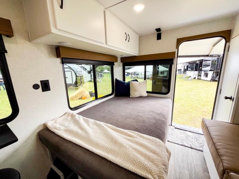 Make every outdoor adventure count with a Hopper travel trailer or toy hauler travel trailer by Modern Buggy RV! These lightweight units are built to last with a custom steel frame and Azdel walls for added durability. You'll find all the necessities needed inside, such as a 13.5k BTU A/C, a 19k BTU furnace, and a Fogatti on-demand water heater for hot showers after trail riding or hiking. The Hopper is off-road capable with all-terrain tires, electric brakes, and 14" ground clearance. You will also enjoy the black roller shades inside, along with White Sands cabinetry and USB stations to keep your gadgets charged and ready to go!