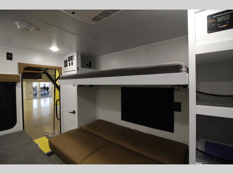 Make every outdoor adventure count with a Hopper travel trailer or toy hauler travel trailer by Modern Buggy RV! These lightweight units are built to last with a custom steel frame and Azdel walls for added durability. You'll find all the necessities needed inside, such as a 13.5k BTU A/C, a 19k BTU furnace, and a Fogatti on-demand water heater for hot showers after trail riding or hiking. The Hopper is off-road capable with all-terrain tires, electric brakes, and 14" ground clearance. You will also enjoy the black roller shades inside, along with White Sands cabinetry and USB stations to keep your gadgets charged and ready to go!