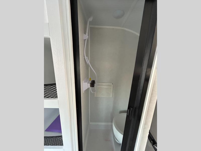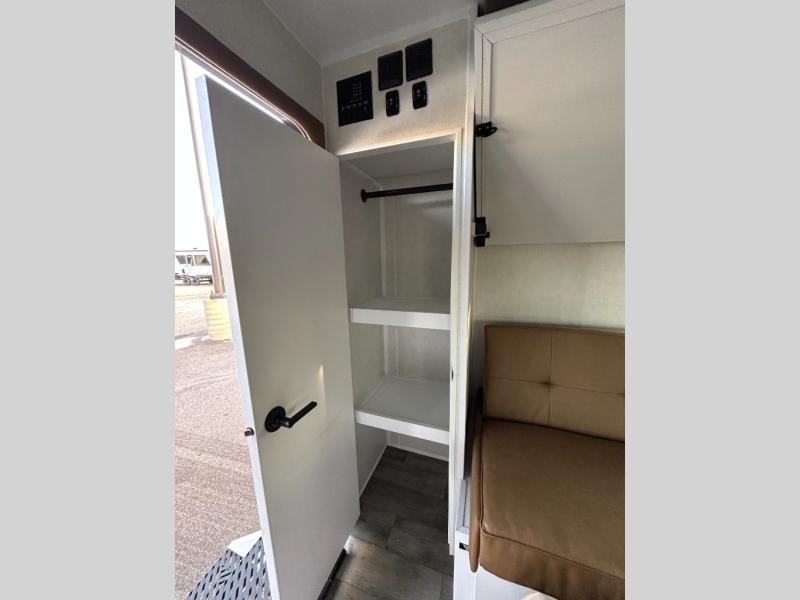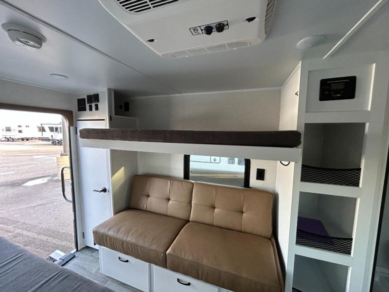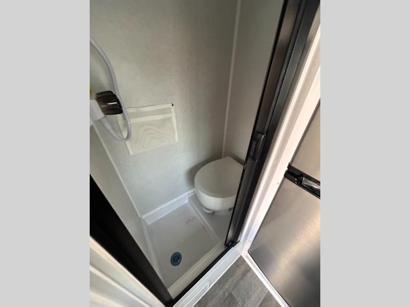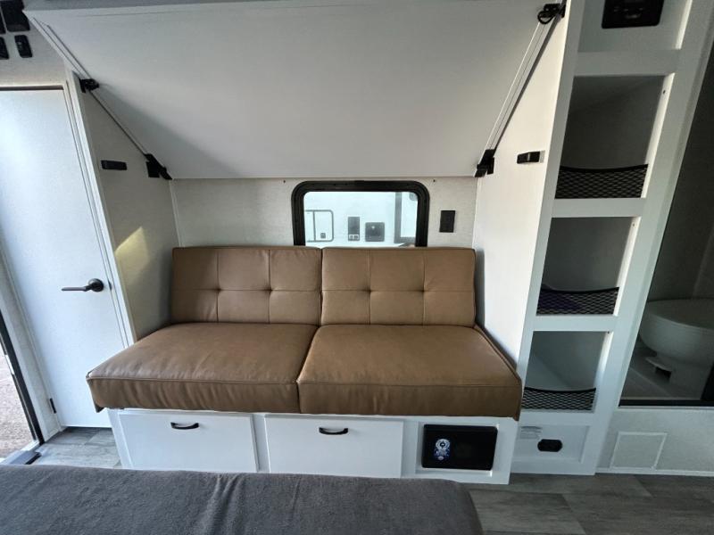 Make every outdoor adventure count with a Hopper travel trailer or toy hauler travel trailer by Modern Buggy RV! These lightweight units are built to last with a custom steel frame and Azdel walls for added durability. You'll find all the necessities needed inside, such as a 13.5k BTU A/C, a 19k BTU furnace, and a Fogatti on-demand water heater for hot showers after trail riding or hiking. The Hopper is off-road capable with all-terrain tires, electric brakes, and 14" ground clearance. You will also enjoy the black roller shades inside, along with White Sands cabinetry and USB stations to keep your gadgets charged and ready to go!