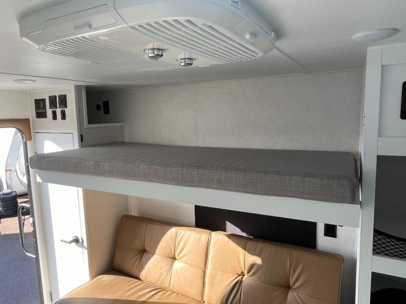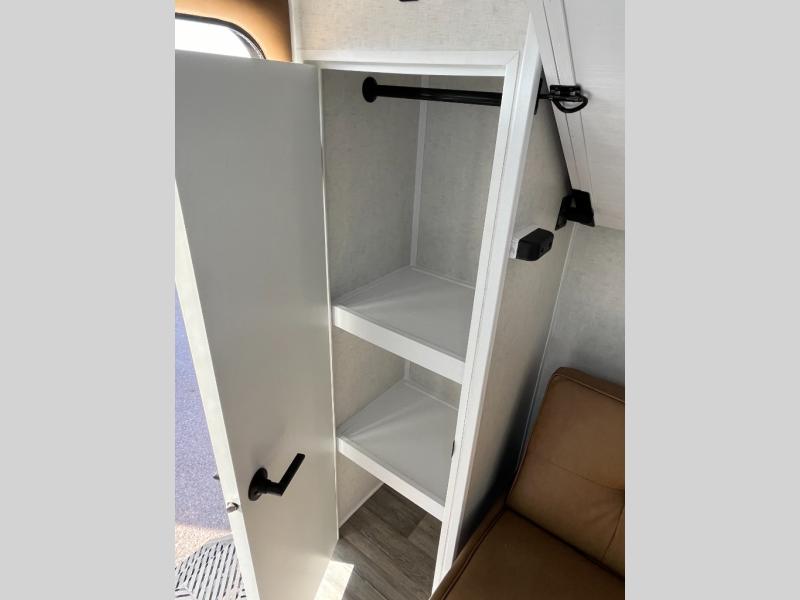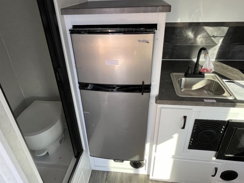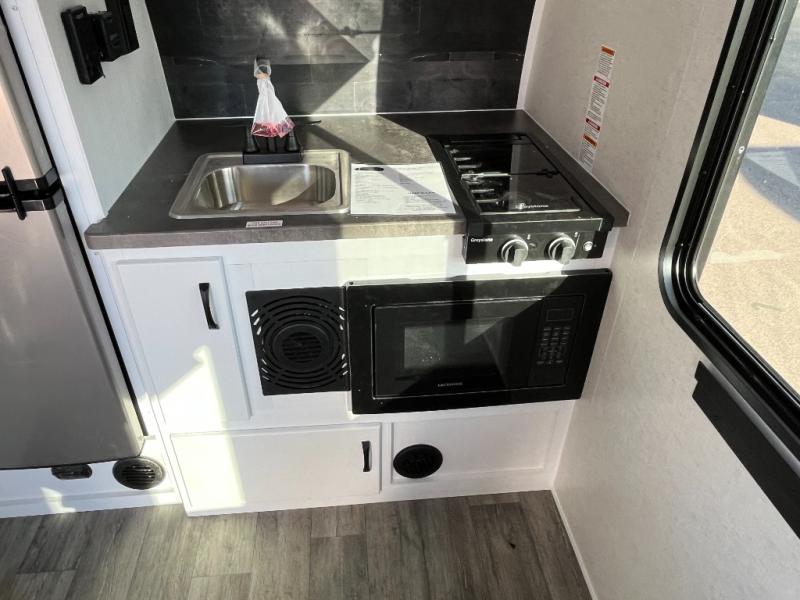 Make every outdoor adventure count with a Hopper travel trailer or toy hauler travel trailer by Modern Buggy RV! These lightweight units are built to last with a custom steel frame and Azdel walls for added durability. You'll find all the necessities needed inside, such as a 13.5k BTU A/C, a 19k BTU furnace, and a Fogatti on-demand water heater for hot showers after trail riding or hiking. The Hopper is off-road capable with all-terrain tires, electric brakes, and 14" ground clearance. You will also enjoy the black roller shades inside, along with White Sands cabinetry and USB stations to keep your gadgets charged and ready to go!