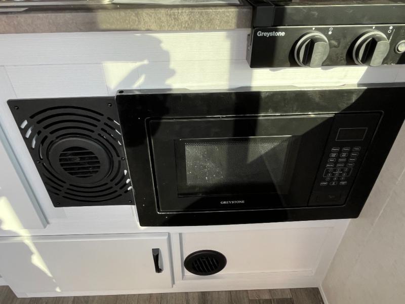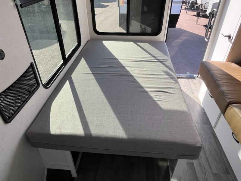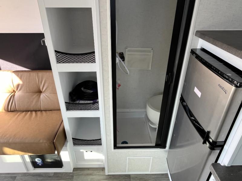 You'll love time at the campground in this lightweight travel trailer! Everything you need for an enjoyable experience has been provided, such as a functional kitchen with a two-burner stove and 12V refrigerator to cook and store food, plus a convenient wet bath so you can freshen up each day! A 68" jack knife sofa with a 68" x 31" bed/bunk above will provide sleeping space for guests, while you take the 45" x 74" bed. There are overhead cabinets for your things, along with two pantries for dry goods, snacks and more!