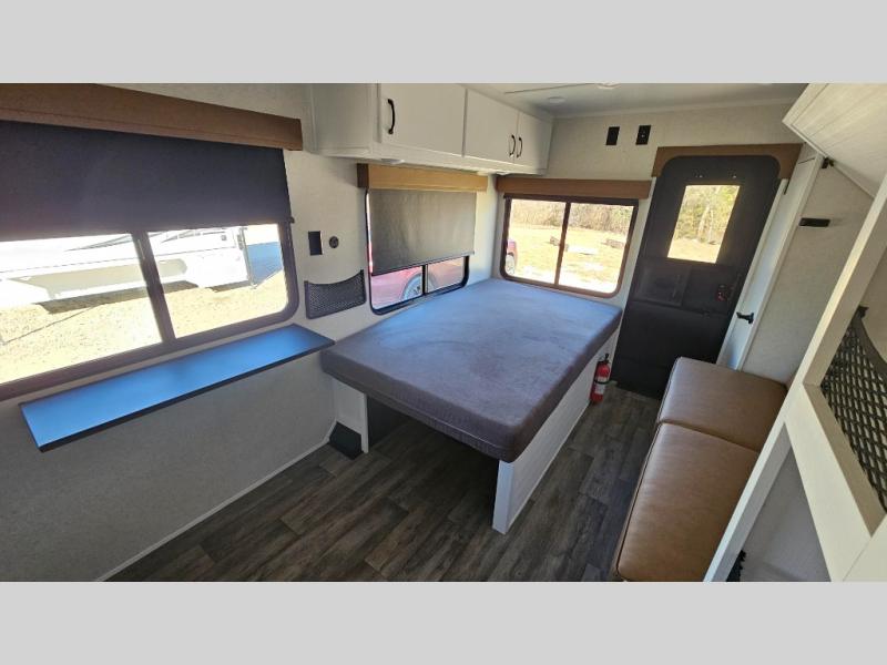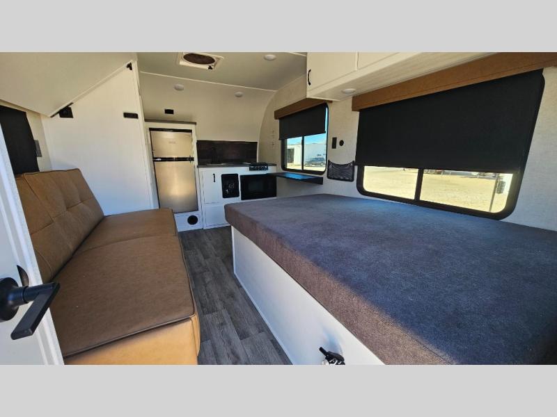 Make every outdoor adventure count with a Hopper travel trailer or toy hauler travel trailer by Modern Buggy RV! These lightweight units are built to last with a custom steel frame and Azdel walls for added durability. You'll find all the necessities needed inside, such as a 13.5k BTU A/C, a 19k BTU furnace, and a Fogatti on-demand water heater for hot showers after trail riding or hiking. The Hopper is off-road capable with all-terrain tires, electric brakes, and 14" ground clearance. You will also enjoy the black roller shades inside, along with White Sands cabinetry and USB stations to keep your gadgets charged and ready to go!