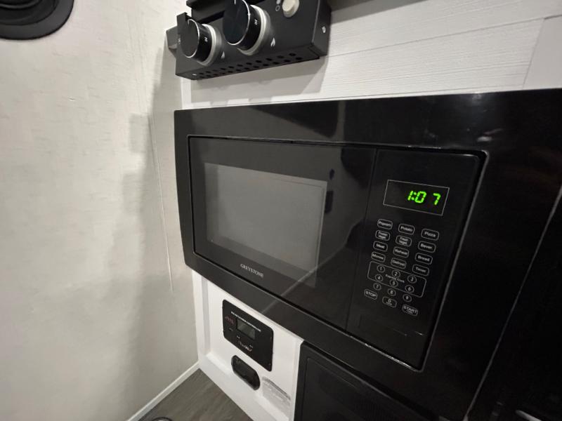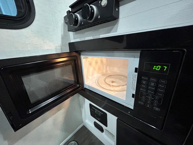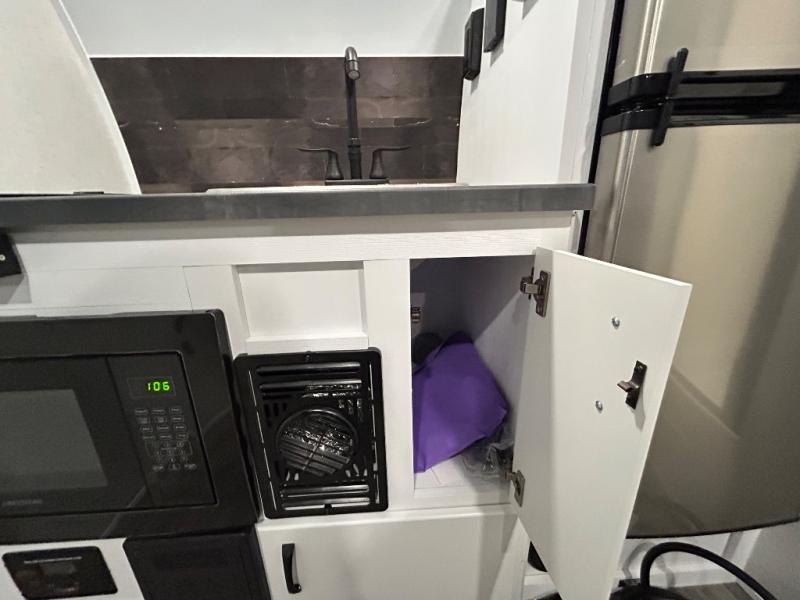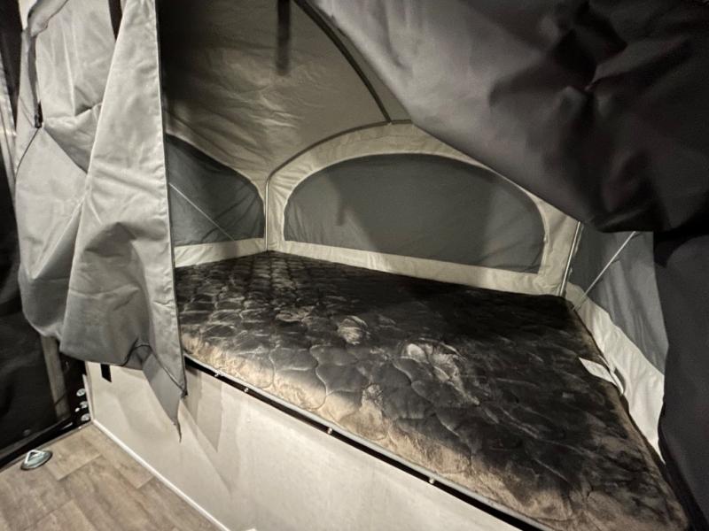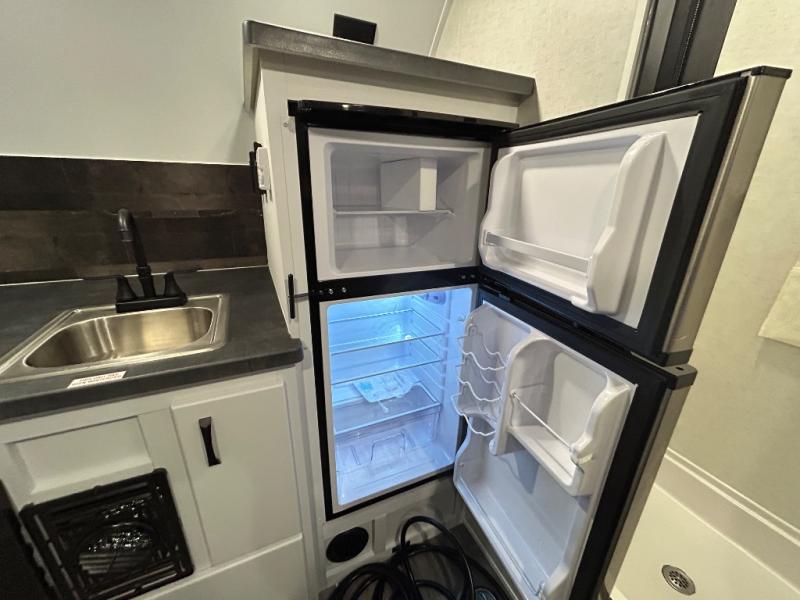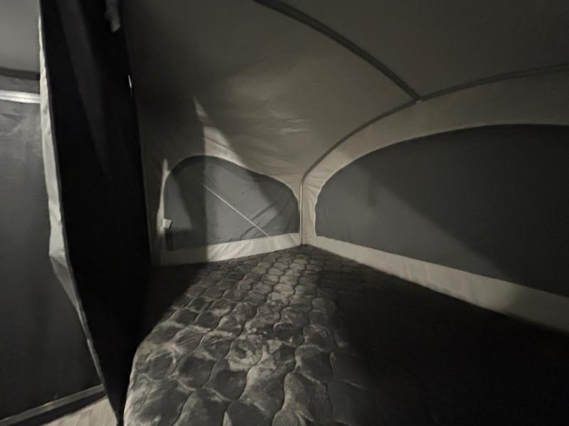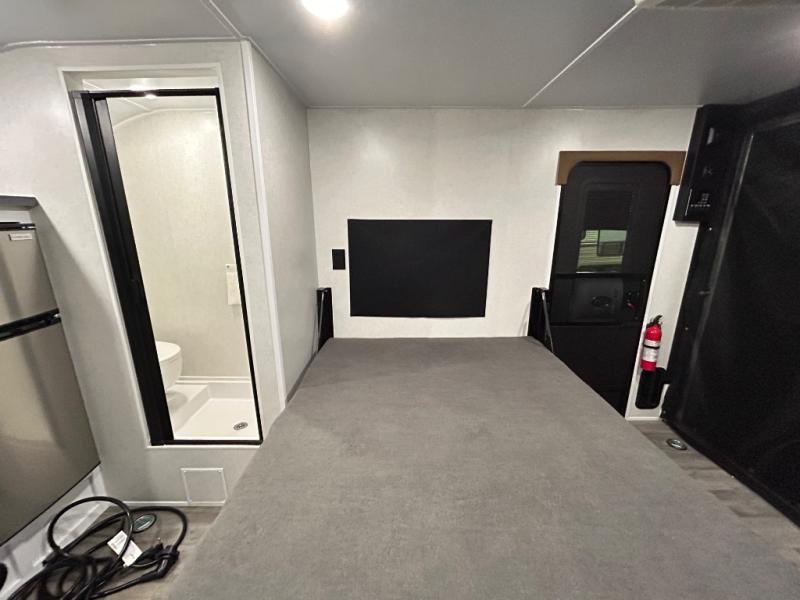 Load up the kayaks or dirt bikes for fun weekends in this toy hauler! Once you've unloaded your toys using the ramp door, you can start lunch in the front corner kitchen that includes a two-burner stove, a 12V refrigerator, and a stainless-steel sink for easy clean up. Speaking of cleaning up, the dry bath is also up front that includes a separate shower and Thetford toilet. And the 50" x 74" Murphy-style bed and side pop-out tent will provide comfy sleeping spaces when you're ready to call it a night!